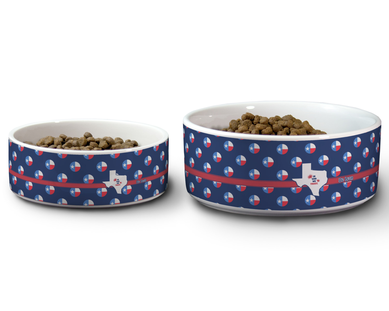We carry these custom dog bowls in two available sizes: medium and large.The medium is 6 inches in diameter and 2.5 inches tall, and can therefore suit pets who eat up to 2.5 cups of food per meal. The large pet bowl is 7 inches in diameter and 3 inches tall, and suits pets who require up to 4.5 cups of food per meal.