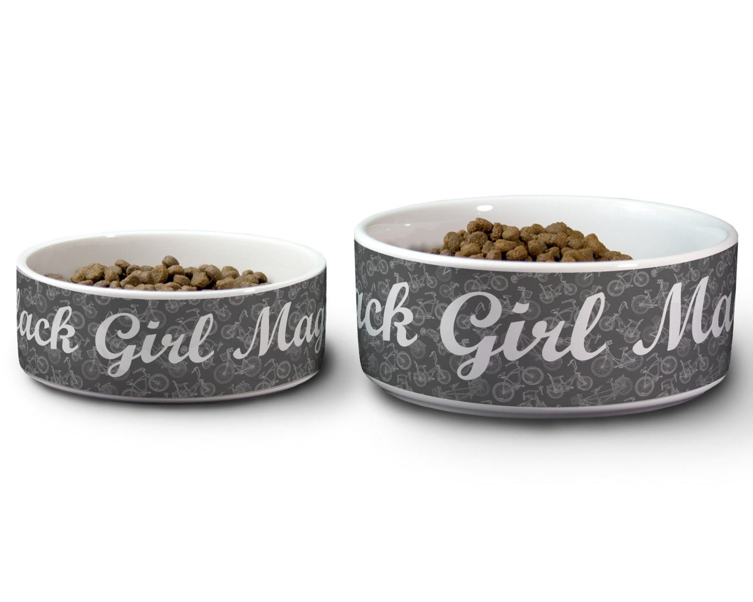 We carry these custom dog bowls in two available sizes: medium and large.The medium is 6 inches in diameter and 2.5 inches tall, and can therefore suit pets who eat up to 2.5 cups of food per meal. The large pet bowl is 7 inches in diameter and 3 inches tall, and suits pets who require up to 4.5 cups of food per meal.