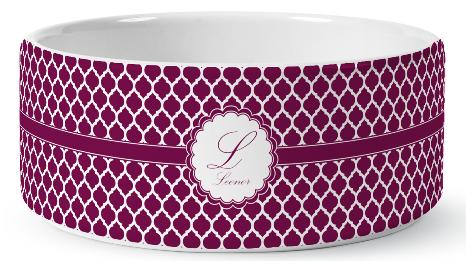 We carry these custom dog bowls in two available sizes: medium and large.The medium is 6 inches in diameter and 2.5 inches tall, and can therefore suit pets who eat up to 2.5 cups of food per meal. The large pet bowl is 7 inches in diameter and 3 inches tall, and suits pets who require up to 4.5 cups of food per meal.