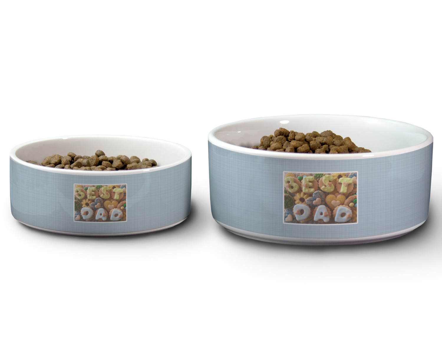 We carry these custom dog bowls in two available sizes: medium and large.The medium is 6 inches in diameter and 2.5 inches tall, and can therefore suit pets who eat up to 2.5 cups of food per meal. The large pet bowl is 7 inches in diameter and 3 inches tall, and suits pets who require up to 4.5 cups of food per meal.