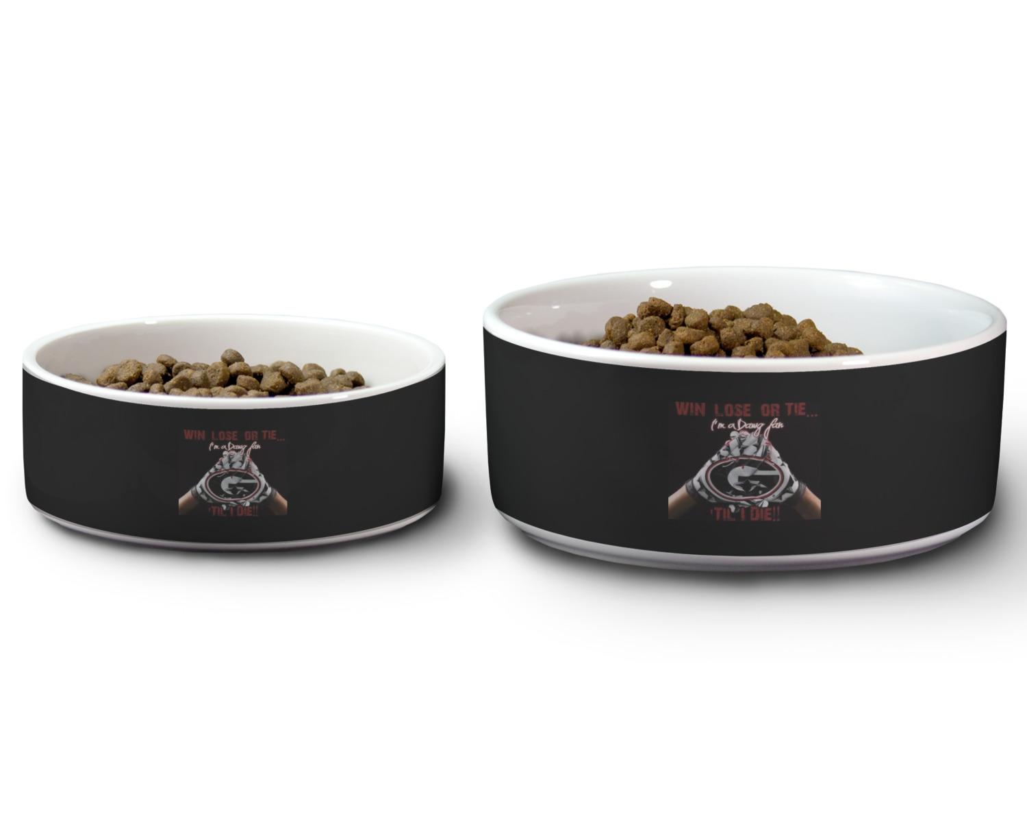We carry these custom dog bowls in two available sizes: medium and large.The medium is 6 inches in diameter and 2.5 inches tall, and can therefore suit pets who eat up to 2.5 cups of food per meal. The large pet bowl is 7 inches in diameter and 3 inches tall, and suits pets who require up to 4.5 cups of food per meal.