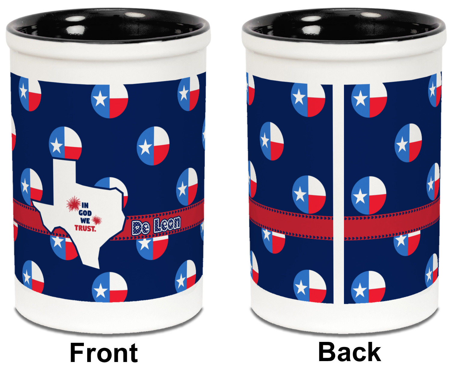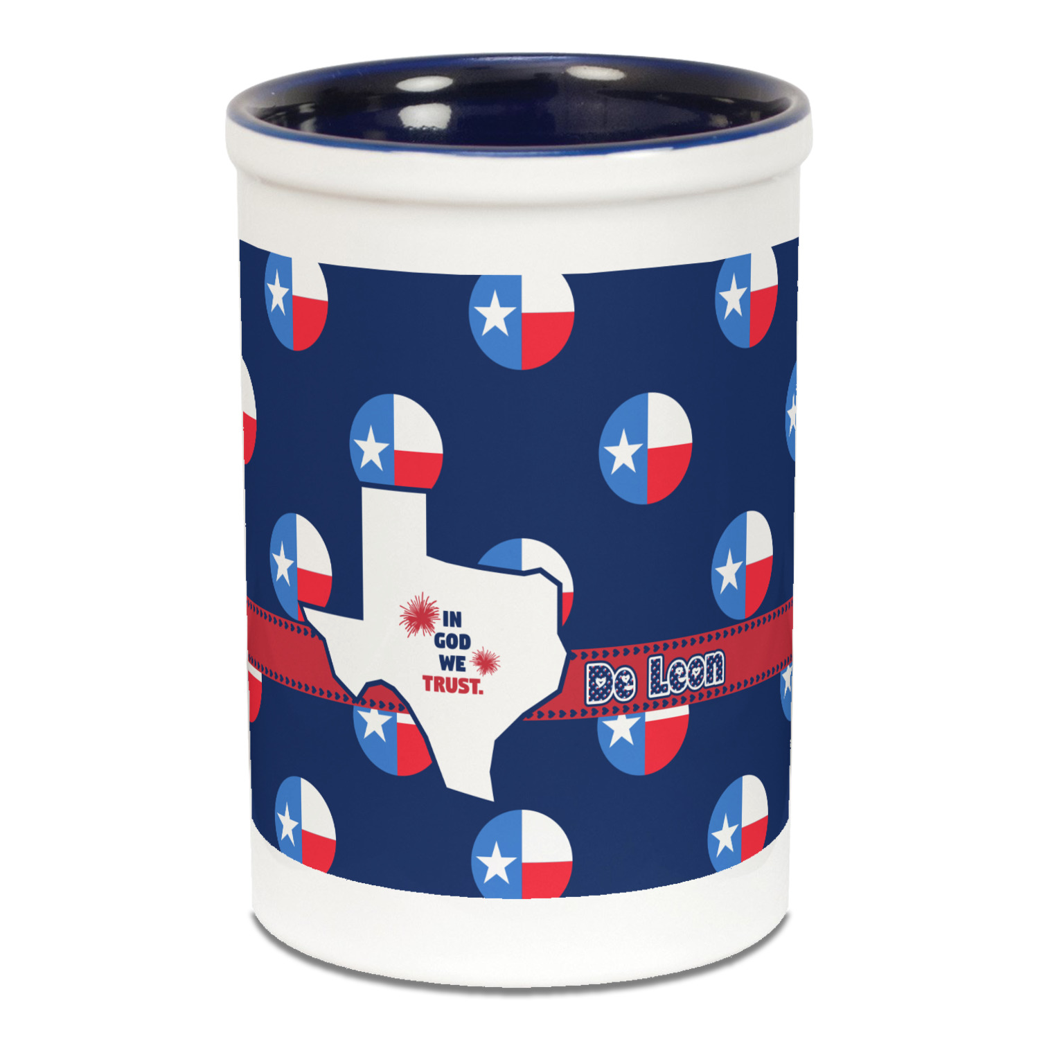 Both the blue and black pencil holders are a ceramic material, giving you a sturdy and long-lasting pen and pencil holder. We print your designs on the exterior of the pencil cup, covering most of the outside surface. There is a small white border on the top and bottom of the exterior of the pen holder, setting apart your design from the interior's color. Our ceramic pen caddy is roughly 3.5" x 3.5" x 5" in dimensions.