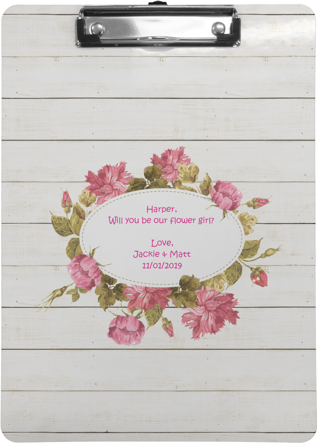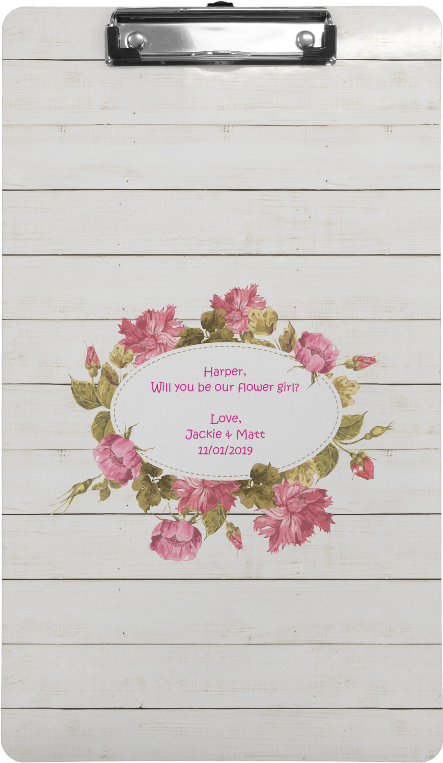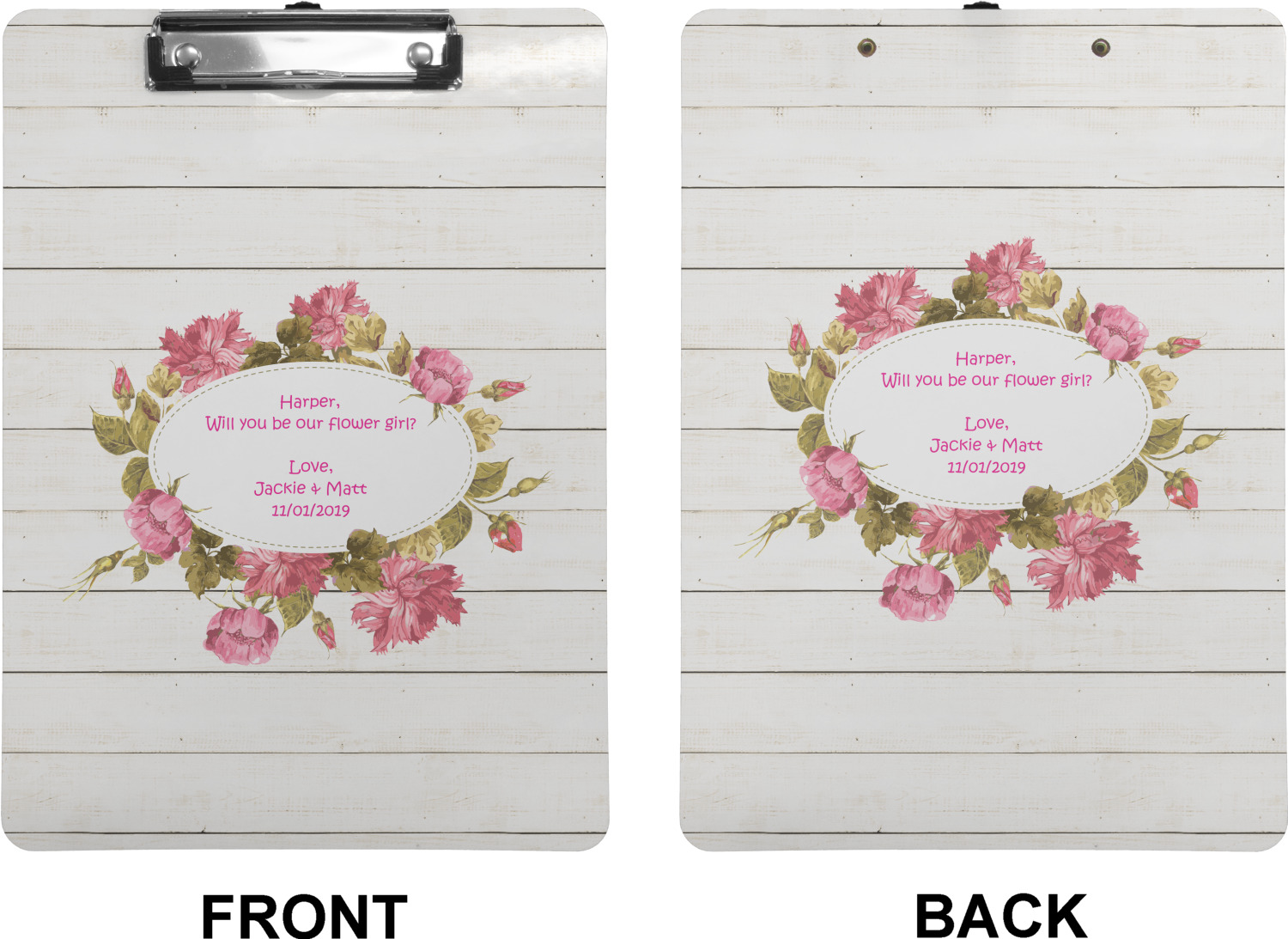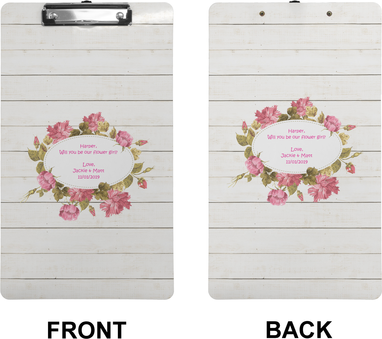 These custom clipboards are made from a strong hardboard and are coated with a glossy finish that accentuates the colors of your design. Alongside a retractable hook at its top, these decorative clipboards also feature sturdy clips to secure several sheets of paper. We sell these clipboards in two separate sizes. Our letter size measures at 12.5" L x 9" W, while our legal clipboard is approximately 15.5" L x 9" W. On both models, your personalization is printed on both sides of this clipboard and can be customized individually.