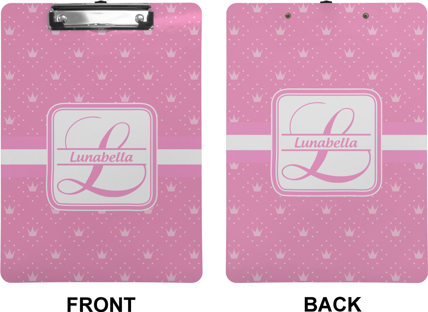 These custom clipboards are made from a strong hardboard and are coated with a glossy finish that accentuates the colors of your design. Alongside a retractable hook at its top, these decorative clipboards also feature sturdy clips to secure several sheets of paper. We sell these clipboards in two separate sizes. Our letter size measures at 12.5" L x 9" W, while our legal clipboard is approximately 15.5" L x 9" W. On both models, your personalization is printed on both sides of this clipboard and can be customized individually.