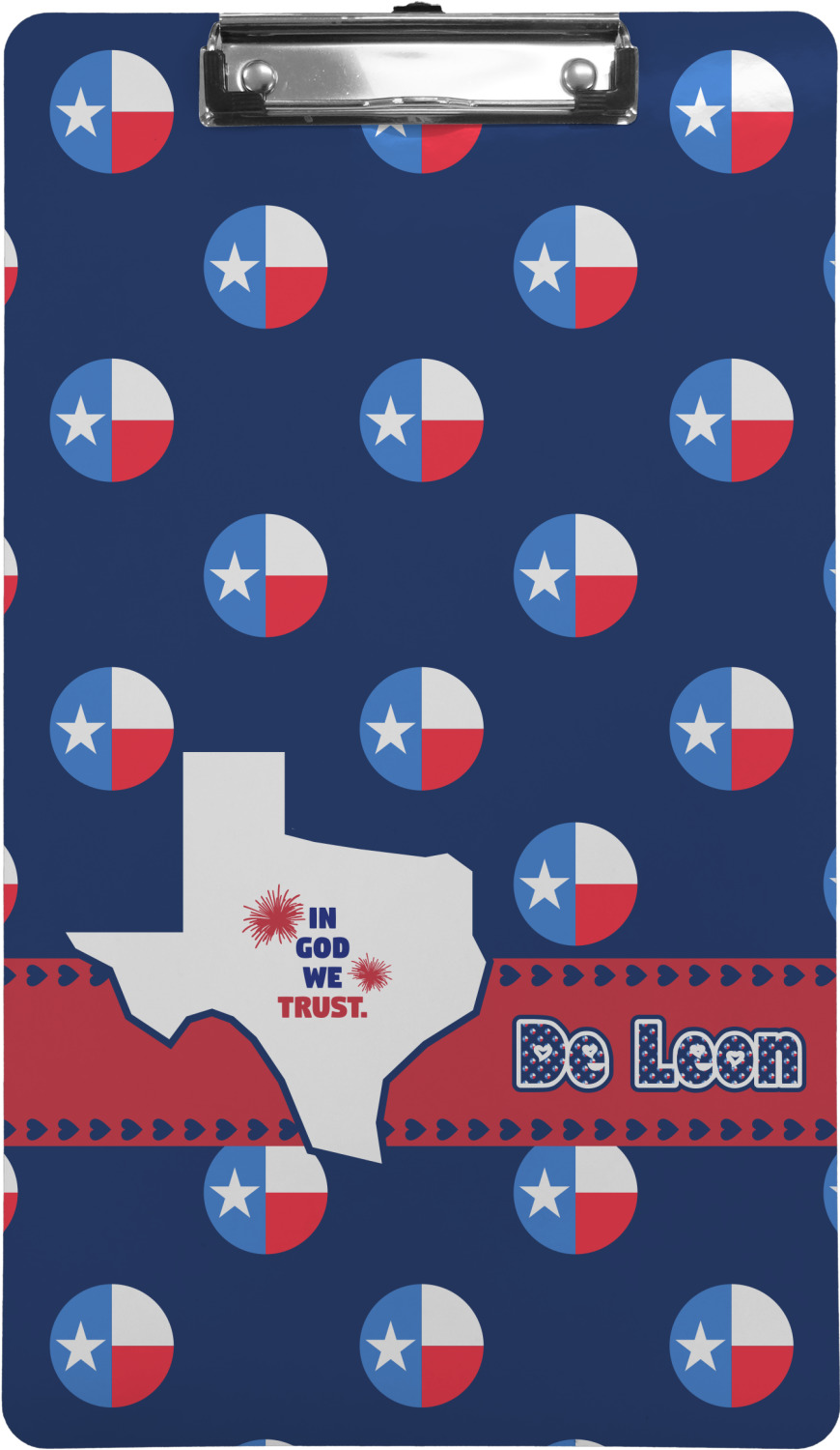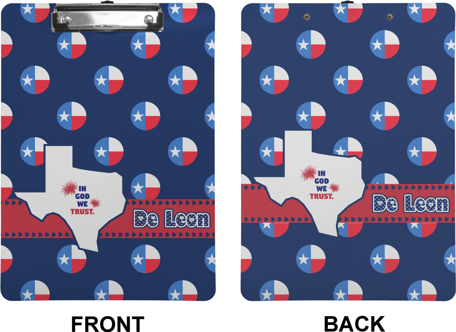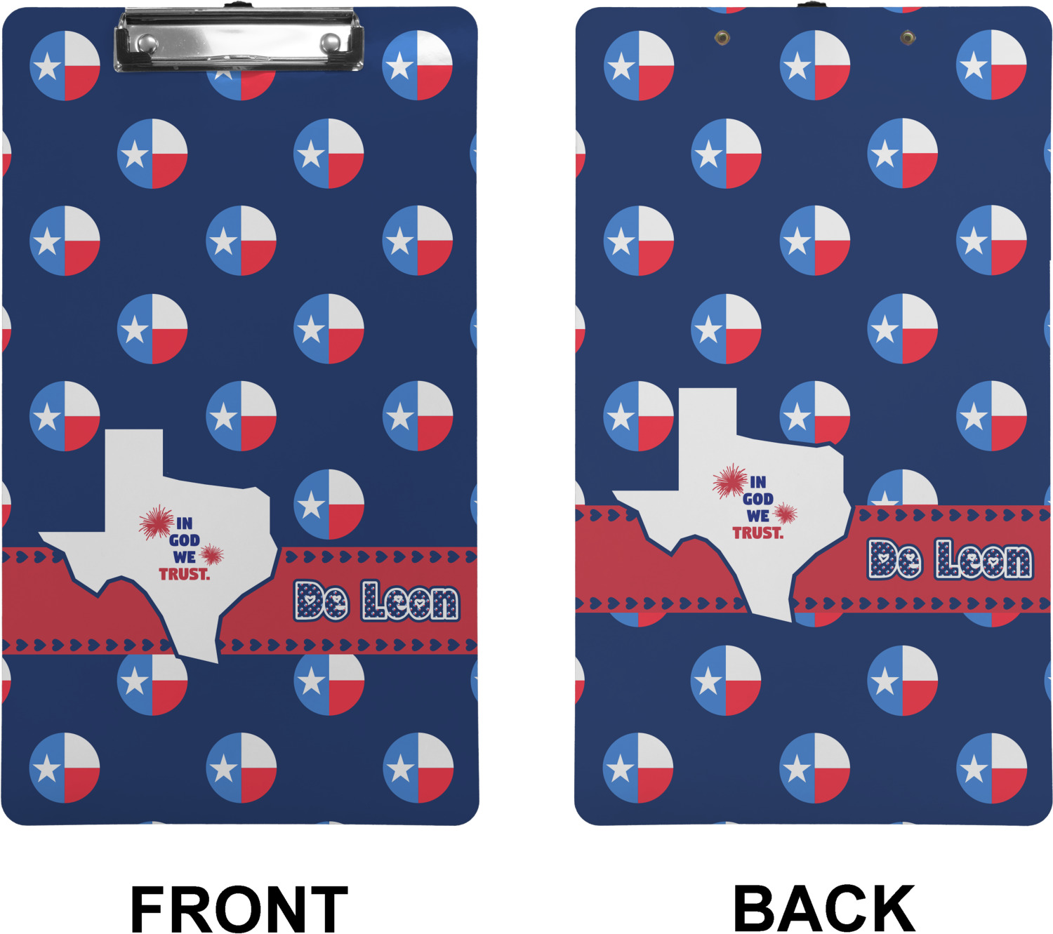 These custom clipboards are made from a strong hardboard and are coated with a glossy finish that accentuates the colors of your design. Alongside a retractable hook at its top, these decorative clipboards also feature sturdy clips to secure several sheets of paper. We sell these clipboards in two separate sizes. Our letter size measures at 12.5" L x 9" W, while our legal clipboard is approximately 15.5" L x 9" W. On both models, your personalization is printed on both sides of this clipboard and can be customized individually.