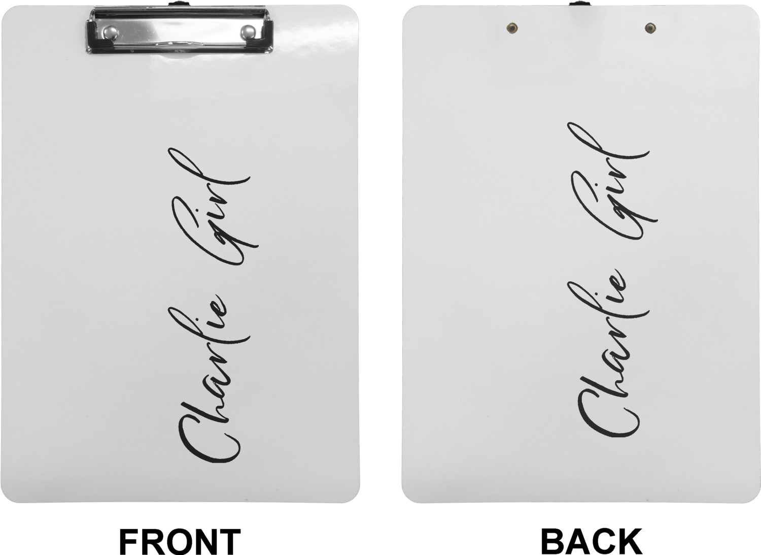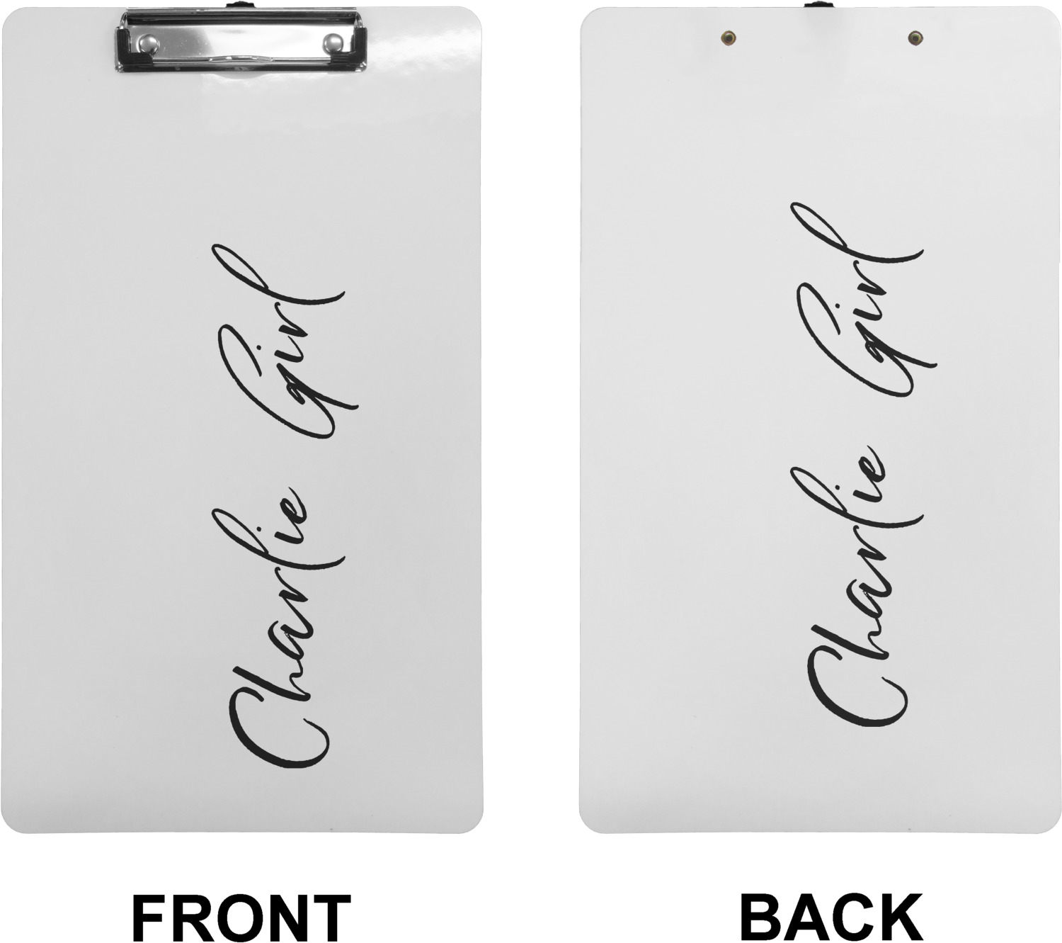 These custom clipboards are made from a strong hardboard and are coated with a glossy finish that accentuates the colors of your design. Alongside a retractable hook at its top, these decorative clipboards also feature sturdy clips to secure several sheets of paper. We sell these clipboards in two separate sizes. Our letter size measures at 12.5" L x 9" W, while our legal clipboard is approximately 15.5" L x 9" W. On both models, your personalization is printed on both sides of this clipboard and can be customized individually.