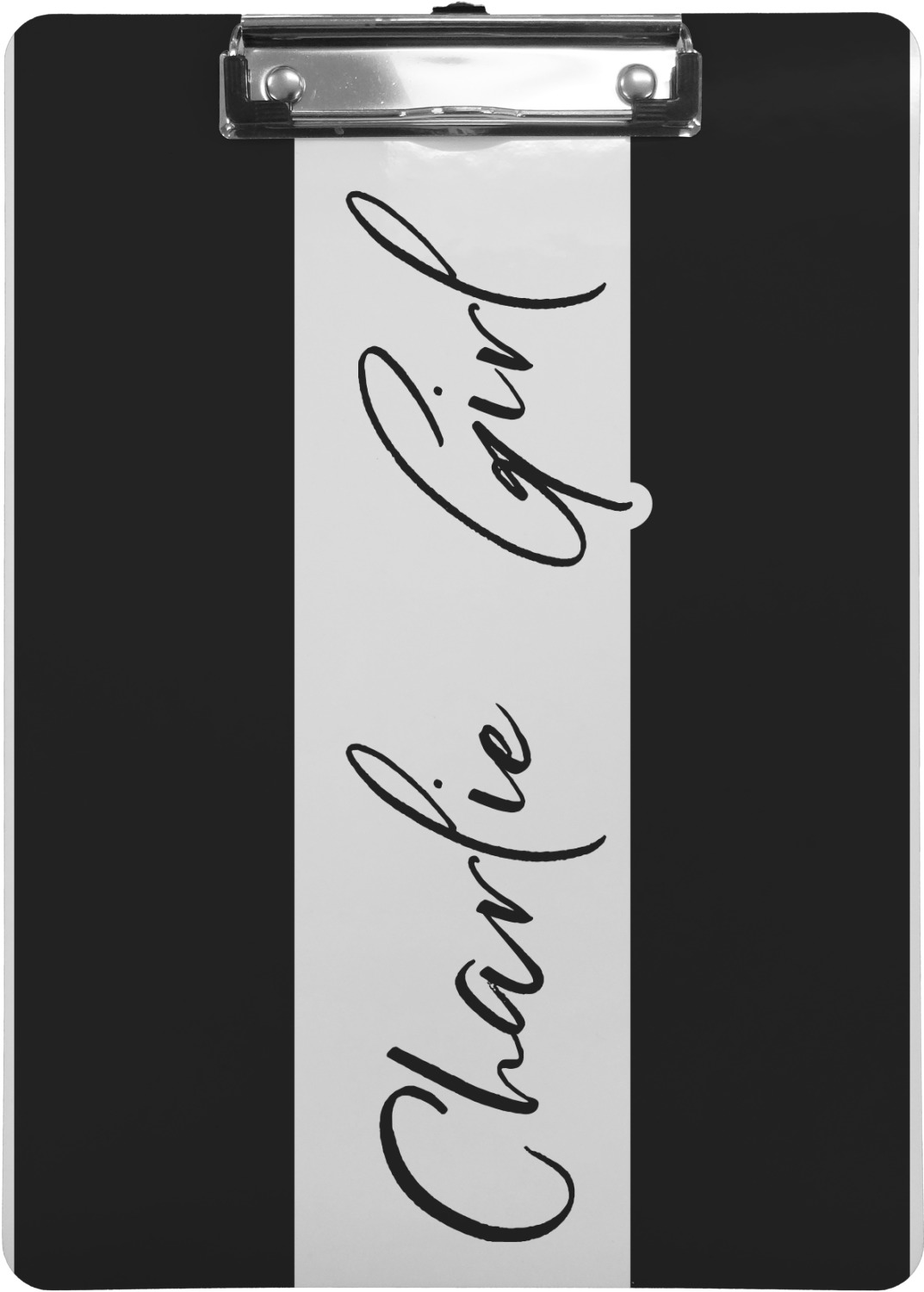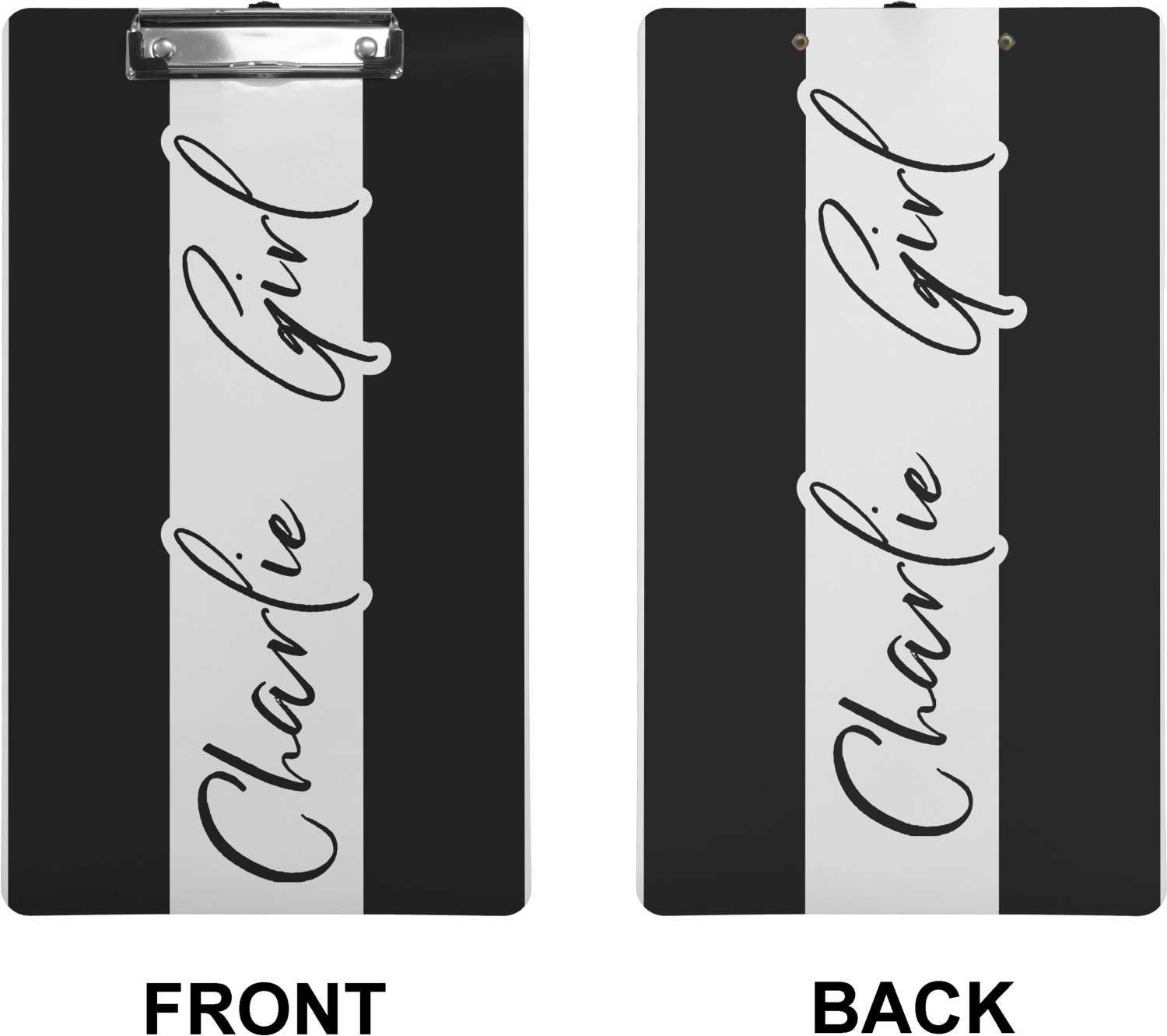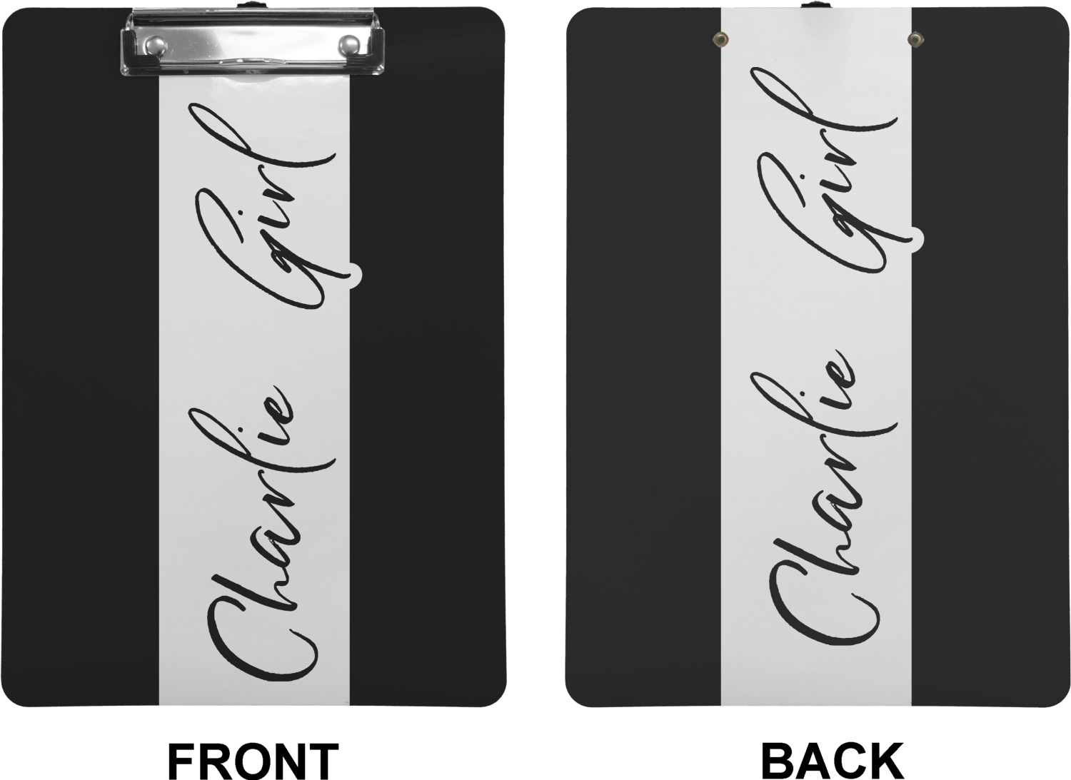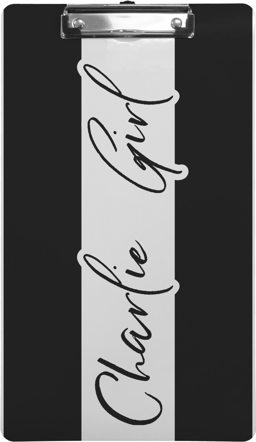 These custom clipboards are made from a strong hardboard and are coated with a glossy finish that accentuates the colors of your design. Alongside a retractable hook at its top, these decorative clipboards also feature sturdy clips to secure several sheets of paper. We sell these clipboards in two separate sizes. Our letter size measures at 12.5" L x 9" W, while our legal clipboard is approximately 15.5" L x 9" W. On both models, your personalization is printed on both sides of this clipboard and can be customized individually.