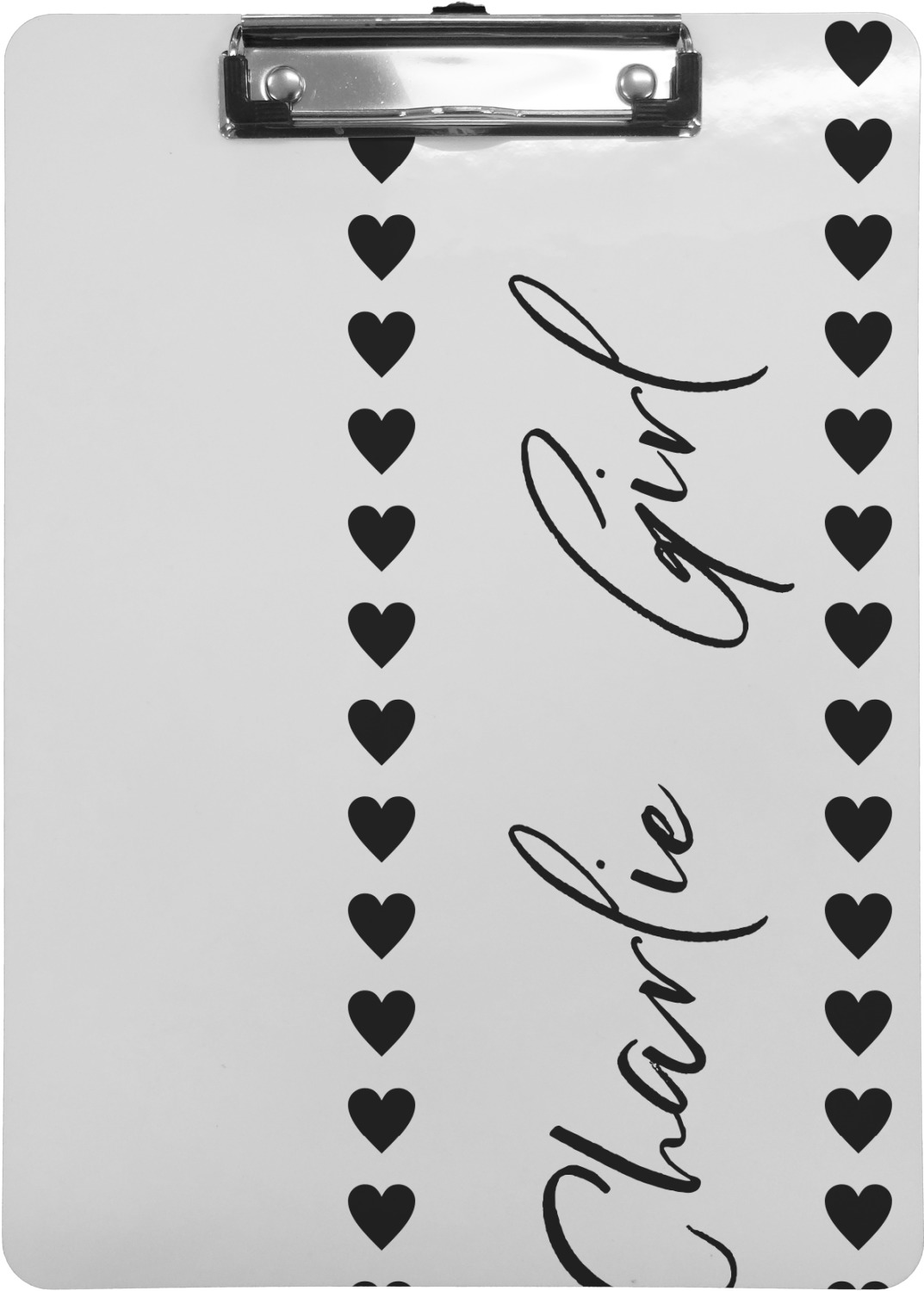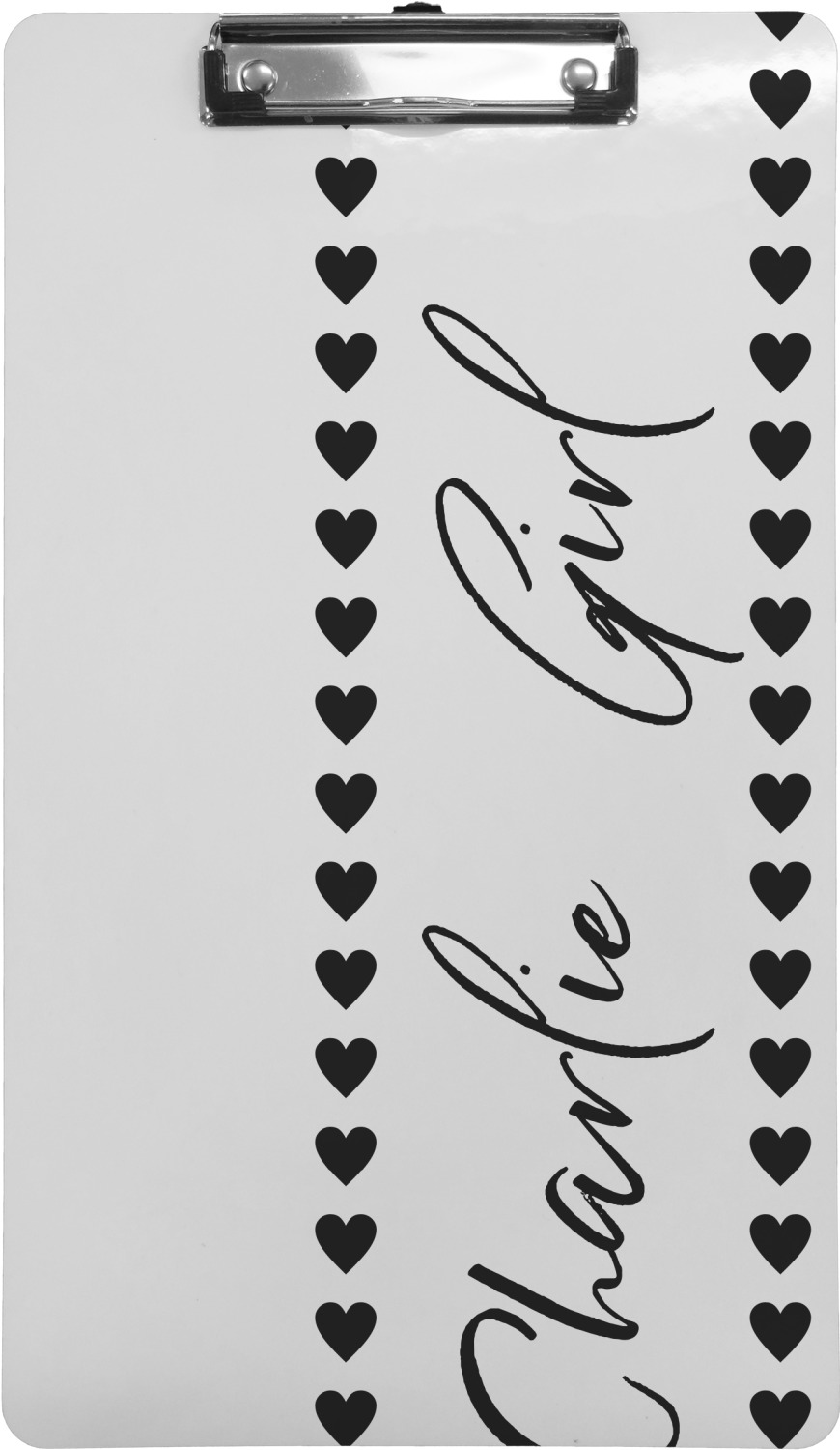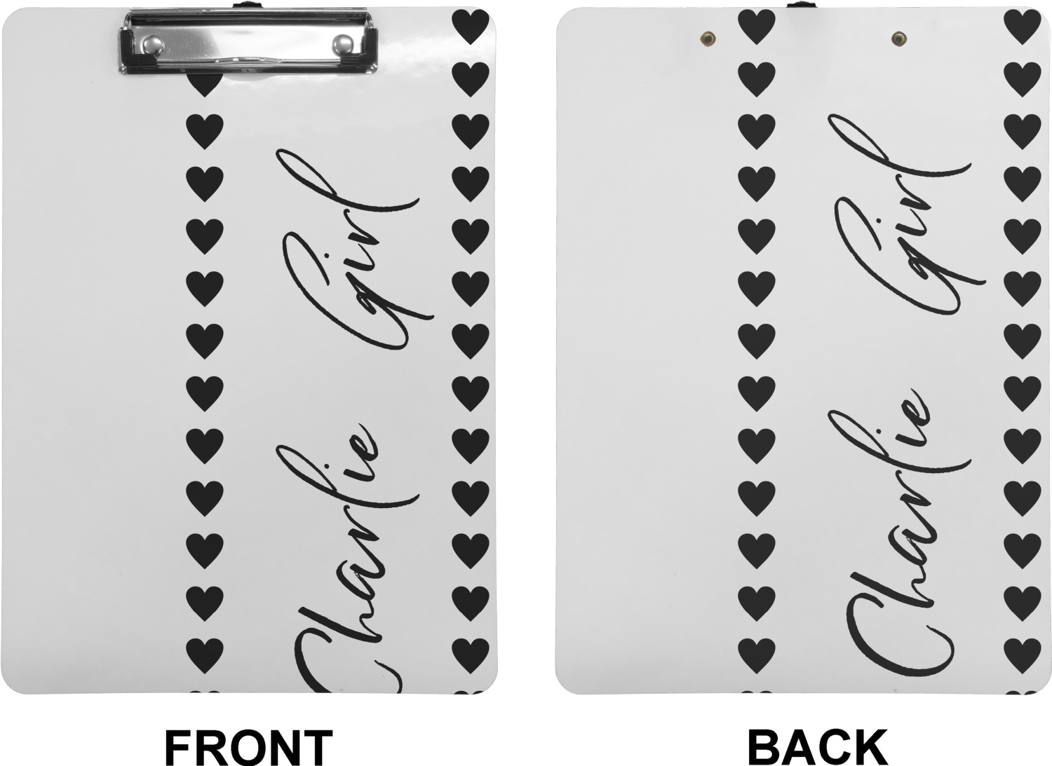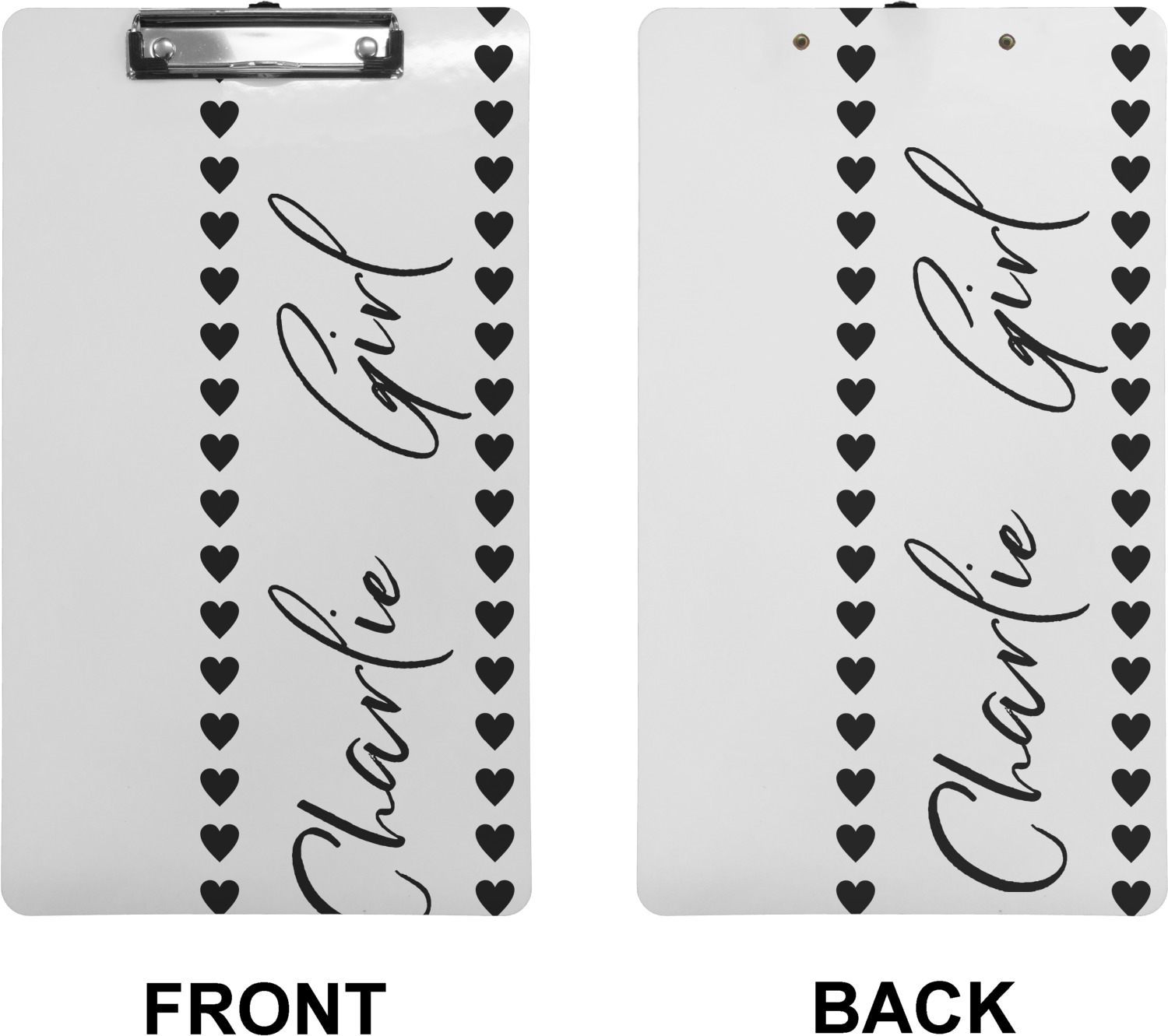 These custom clipboards are made from a strong hardboard and are coated with a glossy finish that accentuates the colors of your design. Alongside a retractable hook at its top, these decorative clipboards also feature sturdy clips to secure several sheets of paper. We sell these clipboards in two separate sizes. Our letter size measures at 12.5" L x 9" W, while our legal clipboard is approximately 15.5" L x 9" W. On both models, your personalization is printed on both sides of this clipboard and can be customized individually.