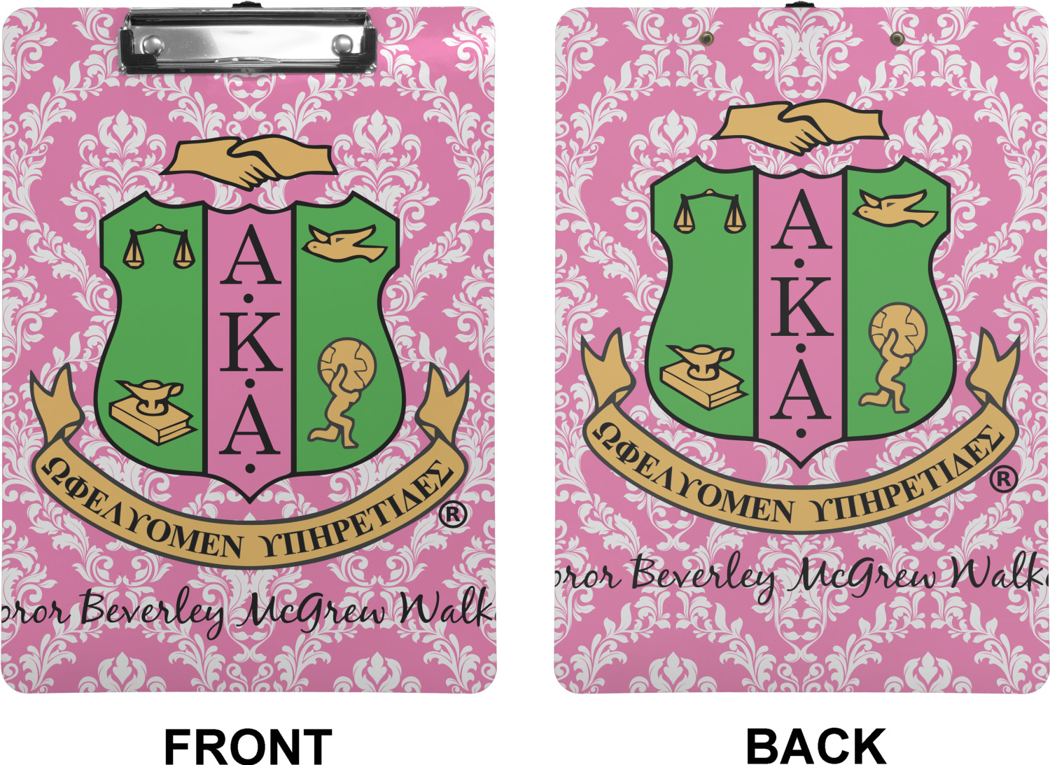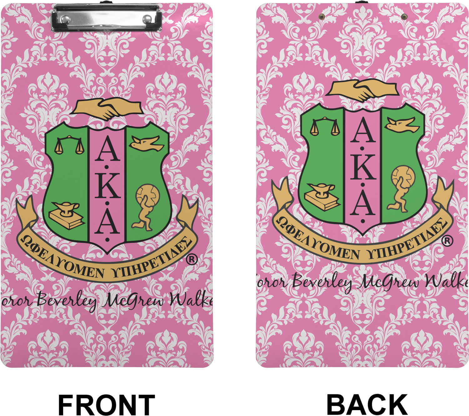 These custom clipboards are made from a strong hardboard and are coated with a glossy finish that accentuates the colors of your design. Alongside a retractable hook at its top, these decorative clipboards also feature sturdy clips to secure several sheets of paper. We sell these clipboards in two separate sizes. Our letter size measures at 12.5" L x 9" W, while our legal clipboard is approximately 15.5" L x 9" W. On both models, your personalization is printed on both sides of this clipboard and can be customized individually.