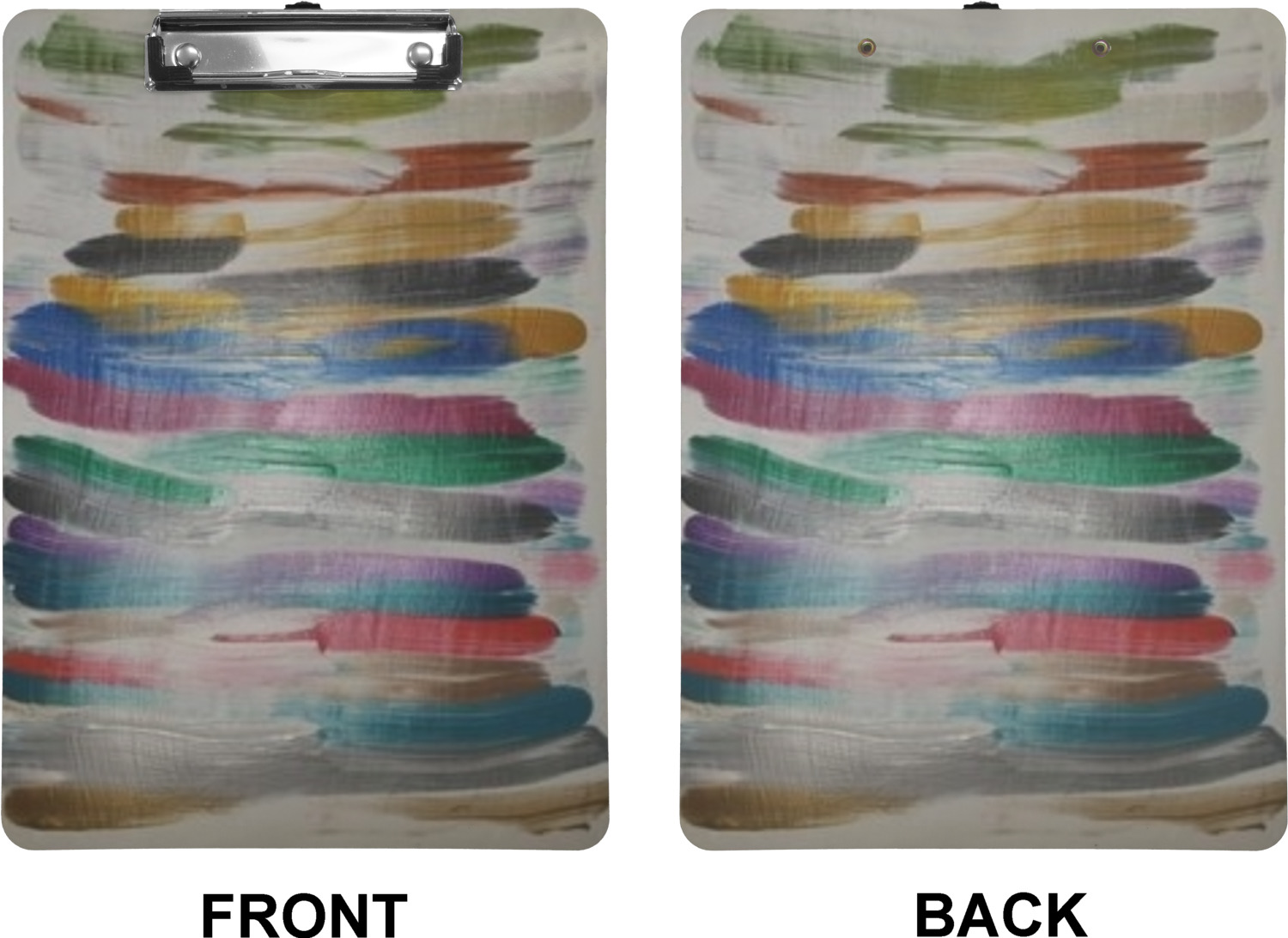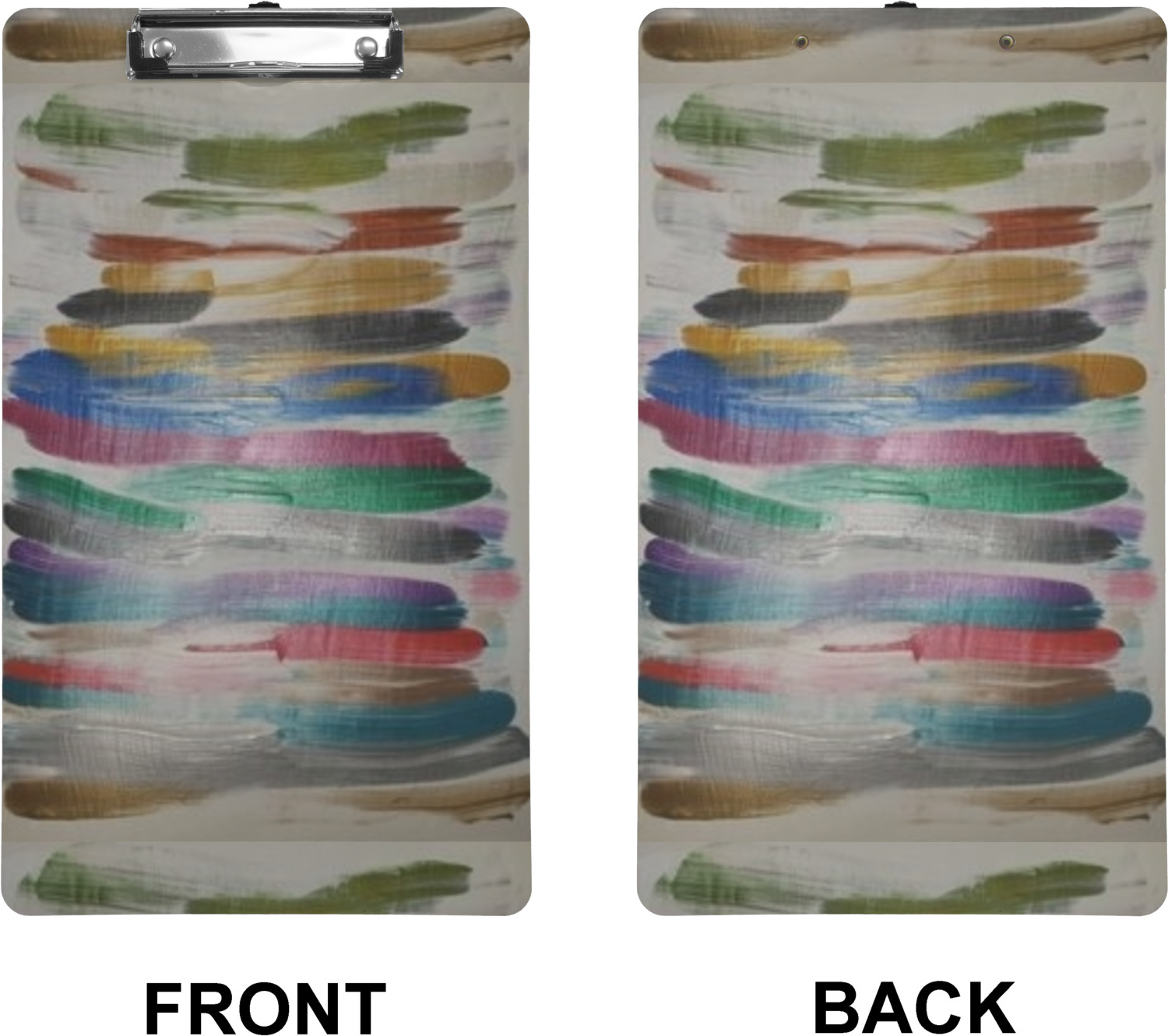 These custom clipboards are made from a strong hardboard and are coated with a glossy finish that accentuates the colors of your design. Alongside a retractable hook at its top, these decorative clipboards also feature sturdy clips to secure several sheets of paper. We sell these clipboards in two separate sizes. Our letter size measures at 12.5" L x 9" W, while our legal clipboard is approximately 15.5" L x 9" W. On both models, your personalization is printed on both sides of this clipboard and can be customized individually.
