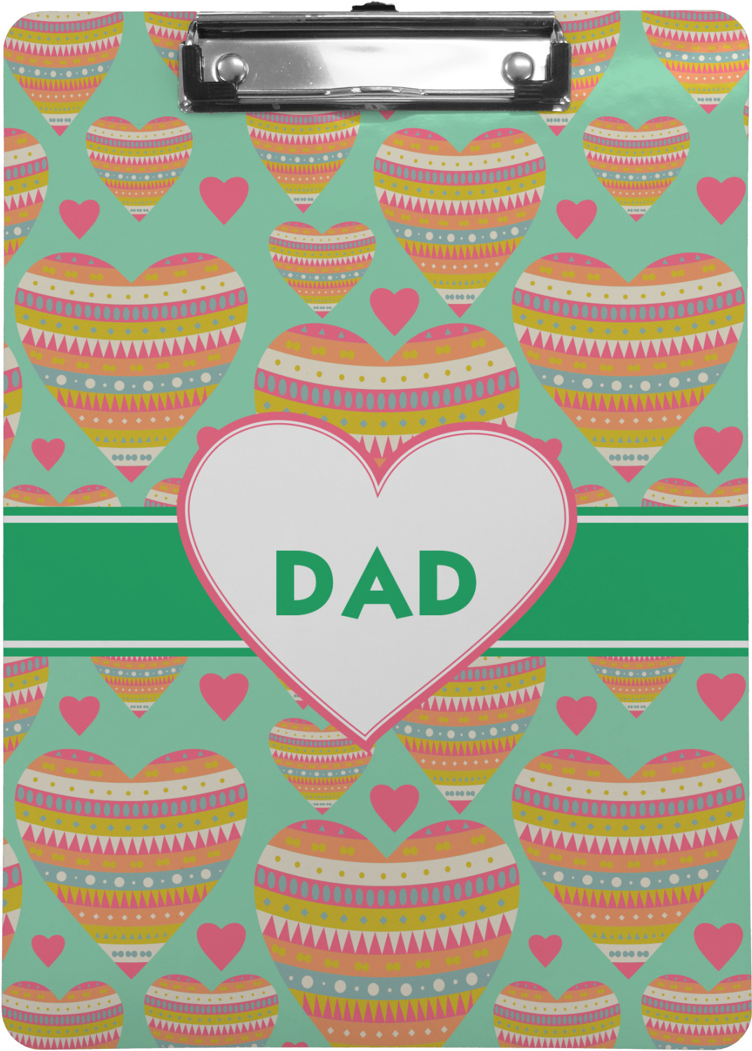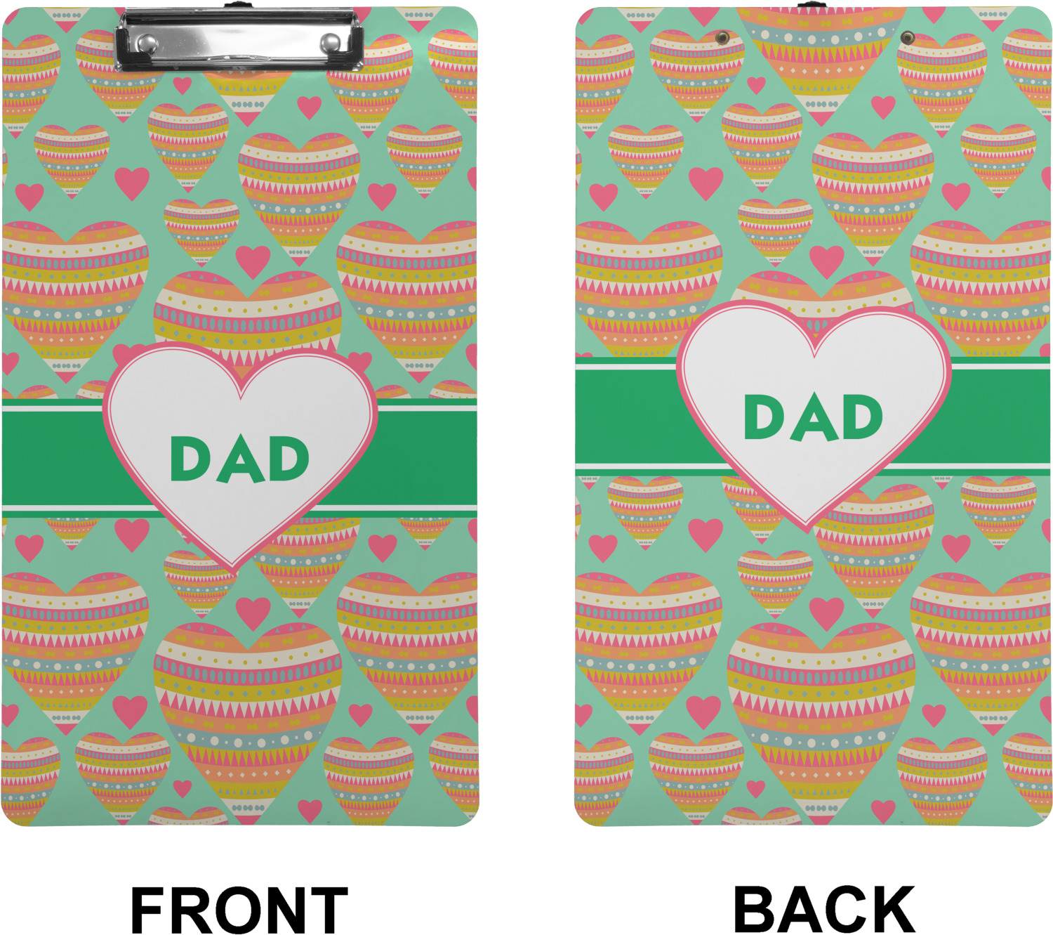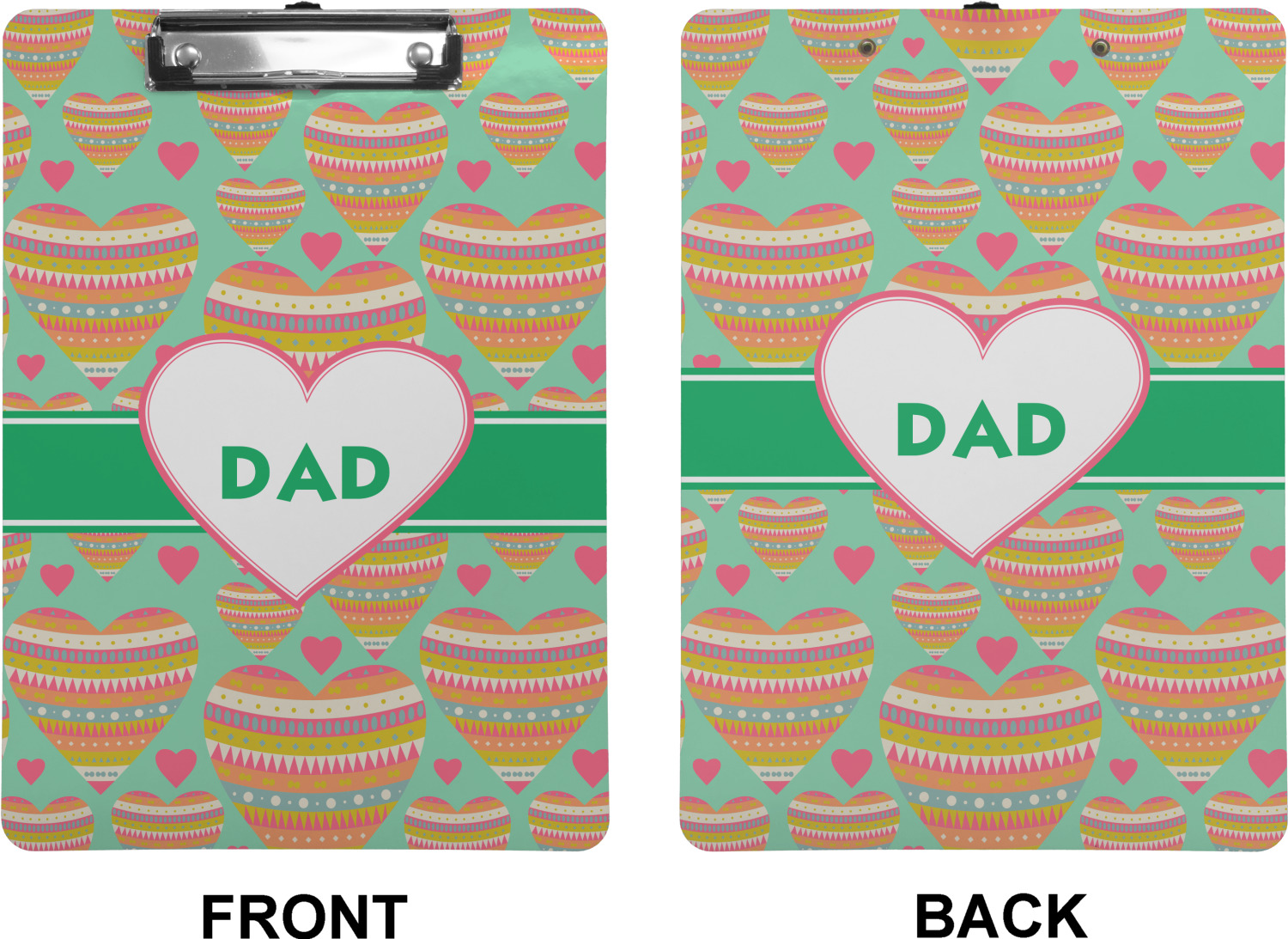 These custom clipboards are made from a strong hardboard and are coated with a glossy finish that accentuates the colors of your design. Alongside a retractable hook at its top, these decorative clipboards also feature sturdy clips to secure several sheets of paper. We sell these clipboards in two separate sizes. Our letter size measures at 12.5" L x 9" W, while our legal clipboard is approximately 15.5" L x 9" W. On both models, your personalization is printed on both sides of this clipboard and can be customized individually.