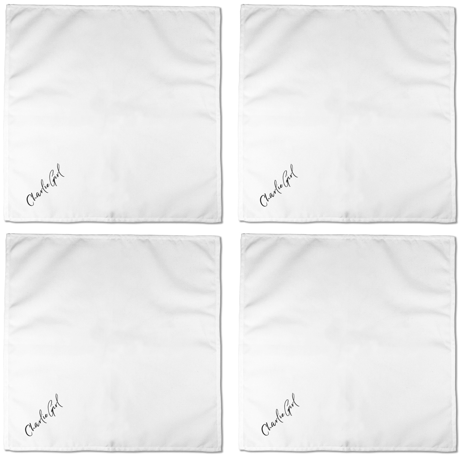 Each customizable cloth napkin is a polyester material guaranteed for long-term use. Since our napkins are cloth, it serves as a great reusable and eco-friendly dining decor. We sell personalized napkins individually or as a set of 4! Print your own unique design on all four napkins, or create four individual designs for each napkin! We offer two different napkin sizes - Cocktail napkins (approx. 10 x 10) and Dinner napkins (approx. 20 x 20). We print your design on one side, perfect for displaying your custom designed lunch napkins in any fold or table setting!