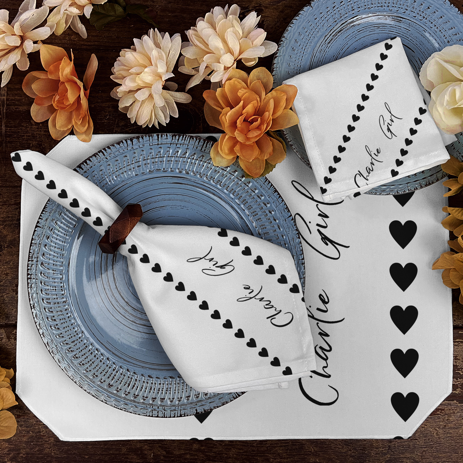 Each customizable cloth napkin is a polyester material guaranteed for long-term use. Since our napkins are cloth, it serves as a great reusable and eco-friendly dining decor. We sell personalized napkins individually or as a set of 4! Print your own unique design on all four napkins, or create four individual designs for each napkin! We offer two different napkin sizes - Cocktail napkins (approx. 10 x 10) and Dinner napkins (approx. 20 x 20). We print your design on one side, perfect for displaying your custom designed lunch napkins in any fold or table setting!