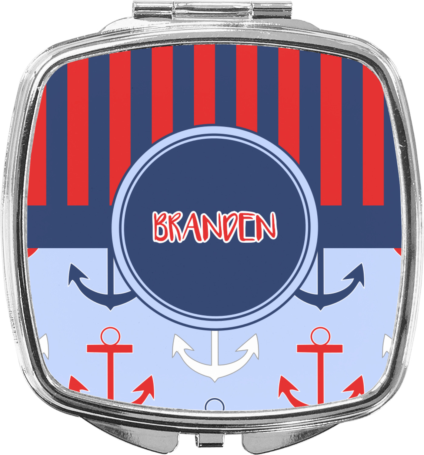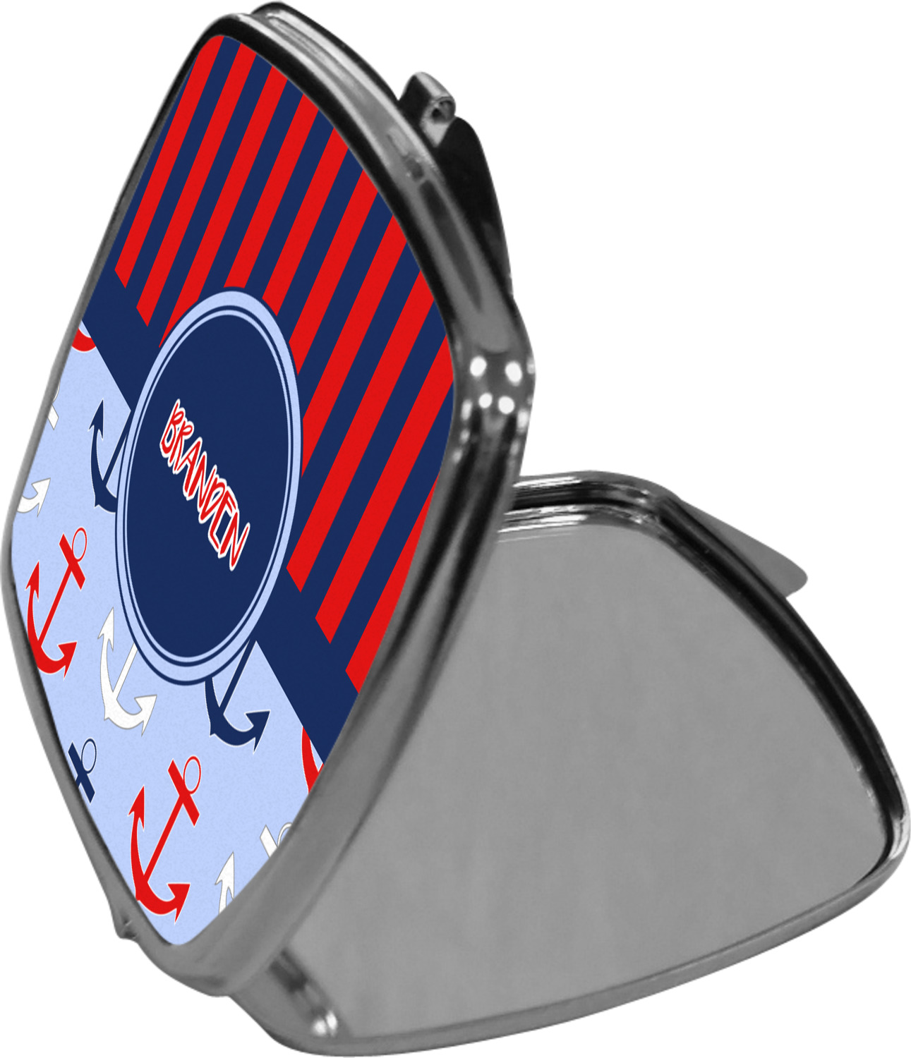 Our compact mirrors are customized with your design on one side. The other side is patterned silver tone metal. Inside, there are two mirrors.