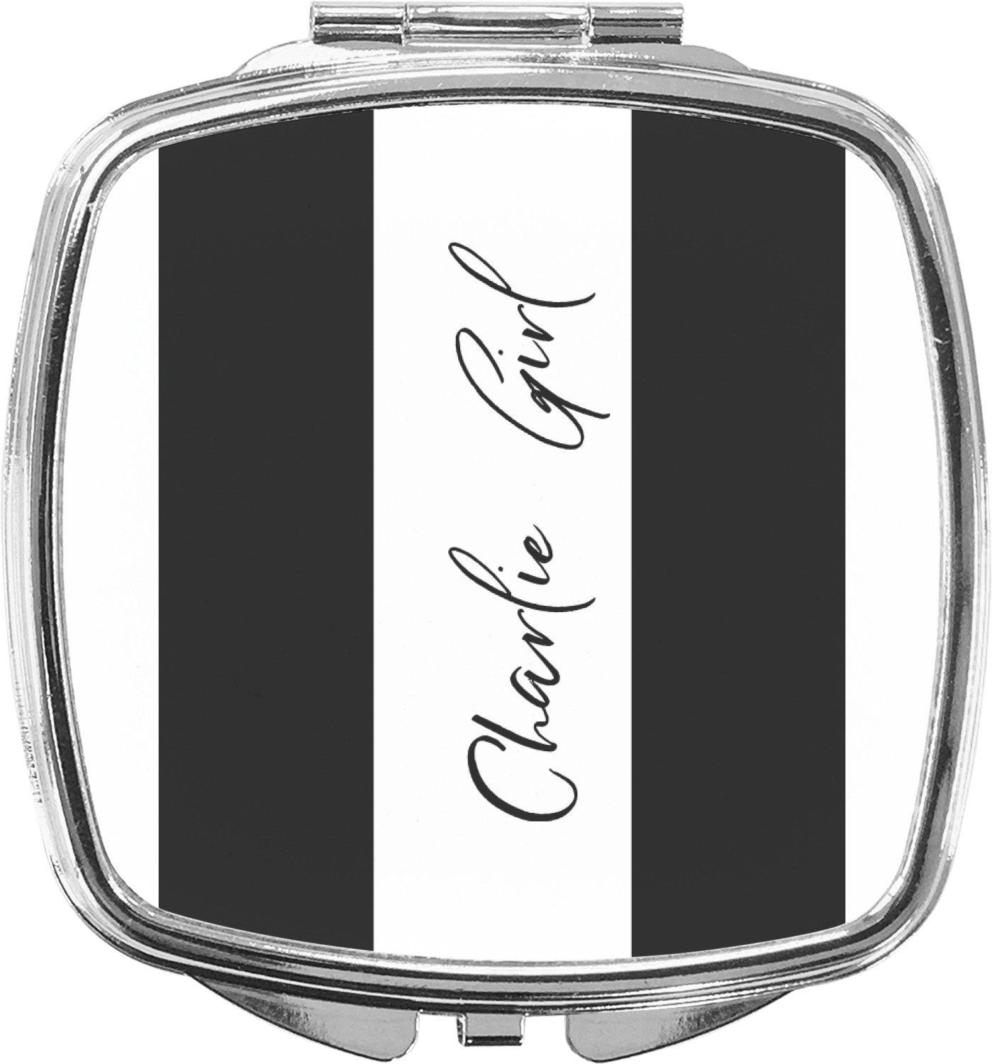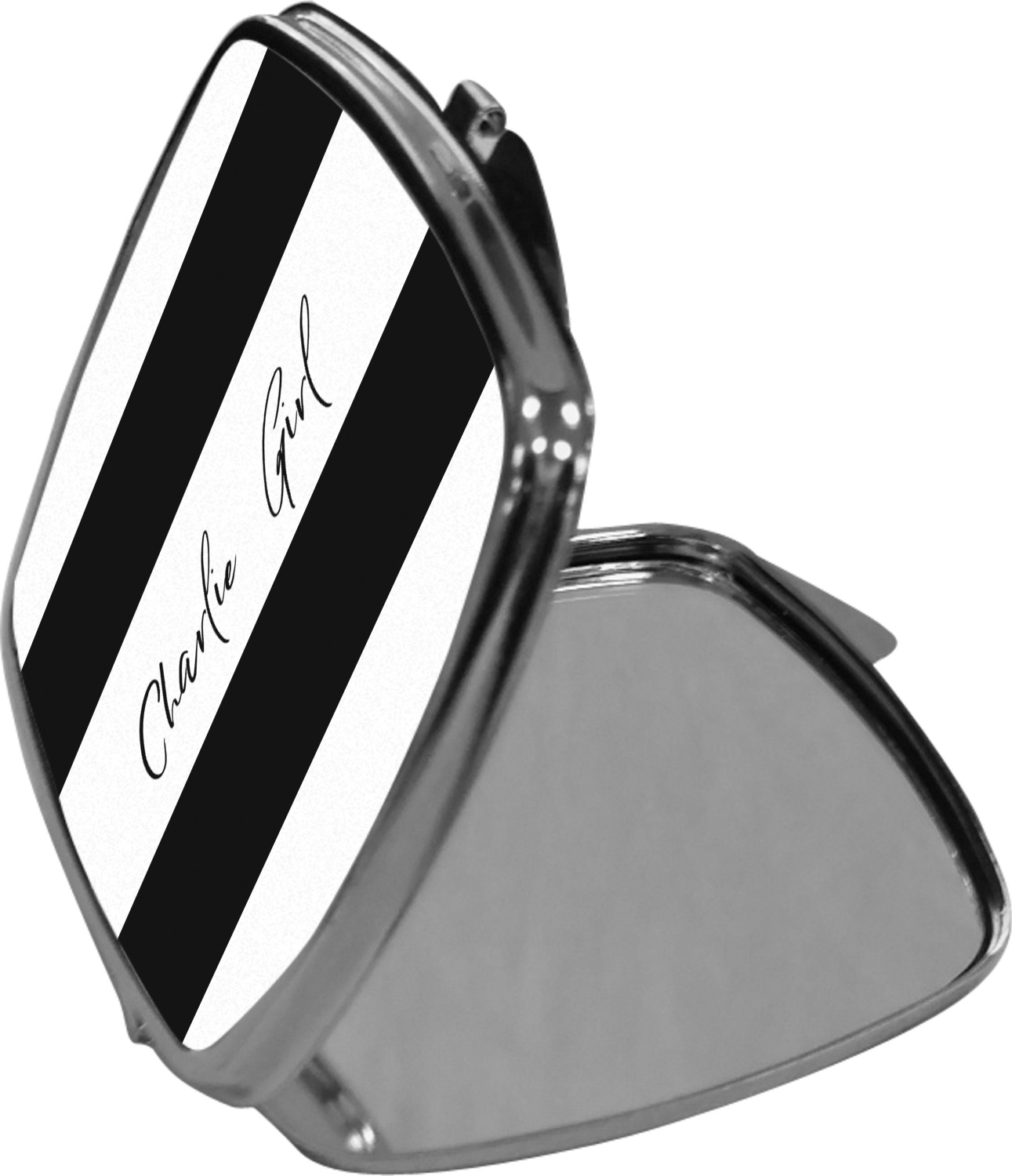 Our compact mirrors are customized with your design on one side. The other side is patterned silver tone metal. Inside, there are two mirrors.