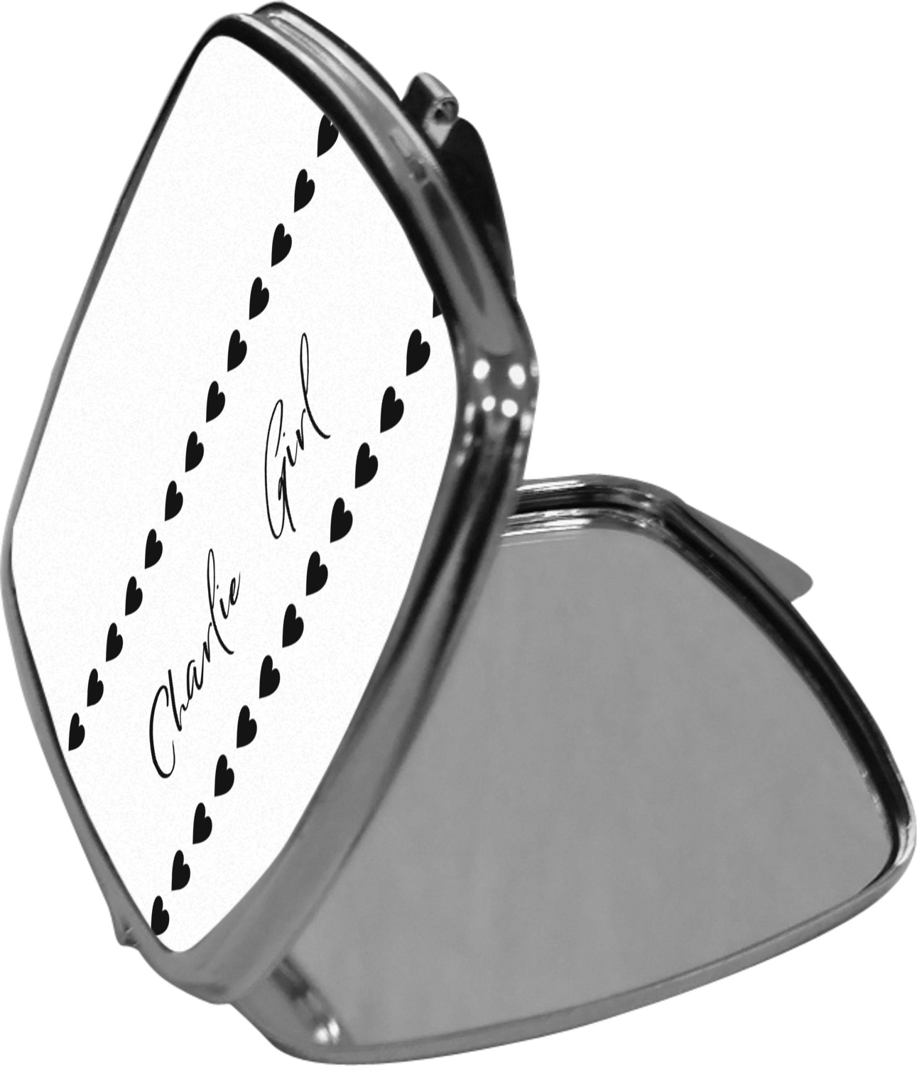 Our compact mirrors are customized with your design on one side. The other side is patterned silver tone metal. Inside, there are two mirrors.