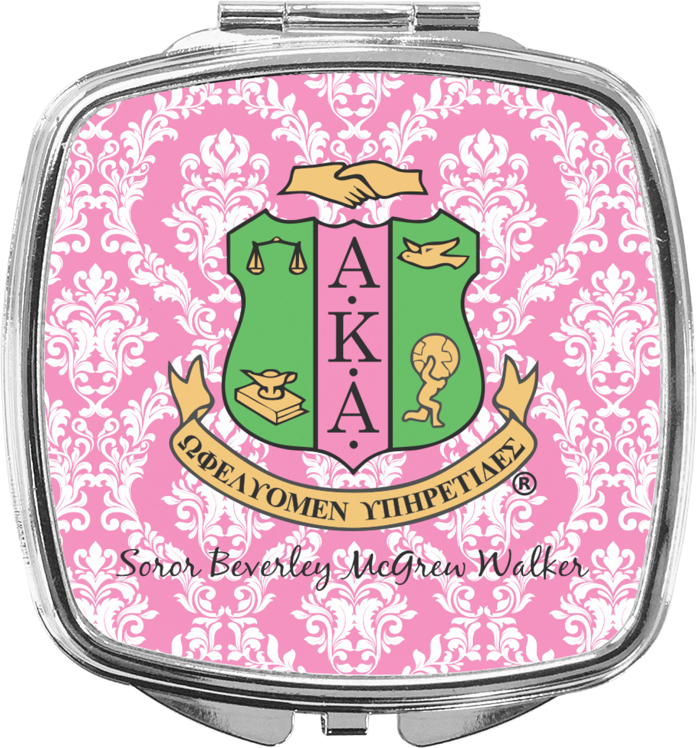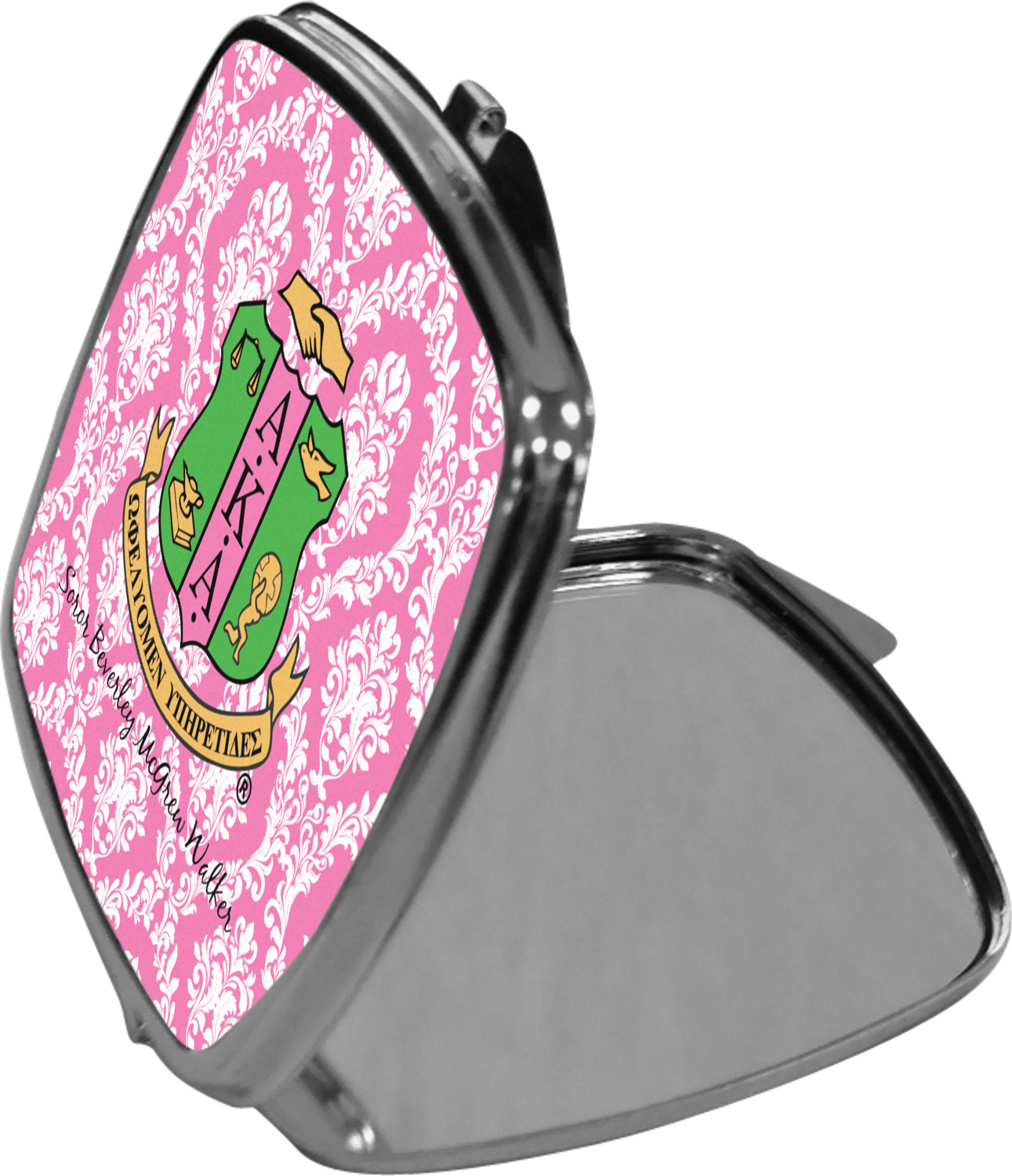 Our compact mirrors are customized with your design on one side. The other side is patterned silver tone metal. Inside, there are two mirrors.