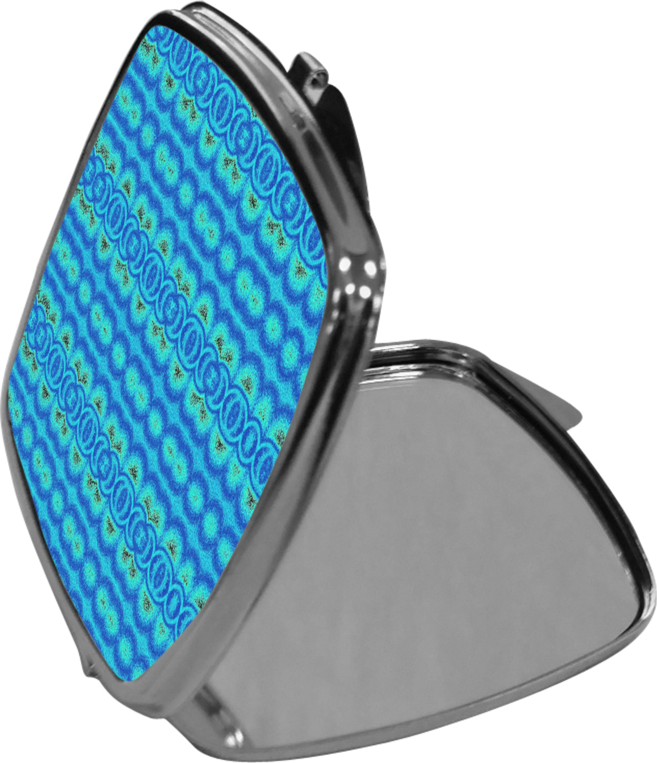 Our compact mirrors are customized with your design on one side. The other side is patterned silver tone metal. Inside, there are two mirrors.