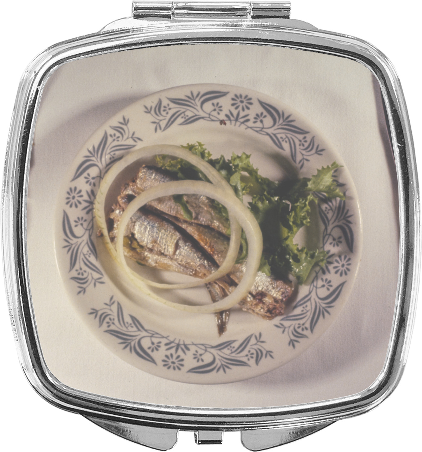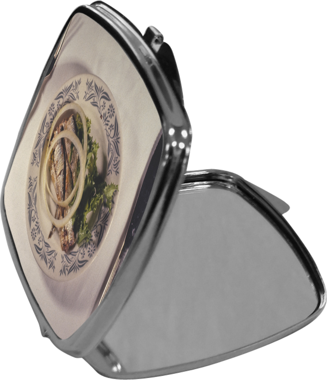 Our compact mirrors are customized with your design on one side. The other side is patterned silver tone metal. Inside, there are two mirrors.