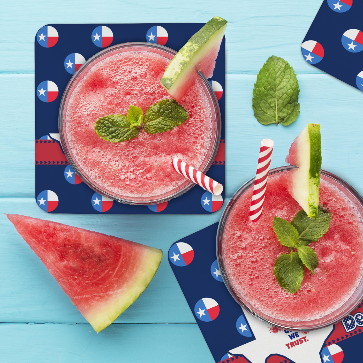 Your custom coasters have a smooth, laminated top and a cork bottom to prevent any unwanted slippage. We print your customized design atop this laminated surface, in bright and vibrant colors.