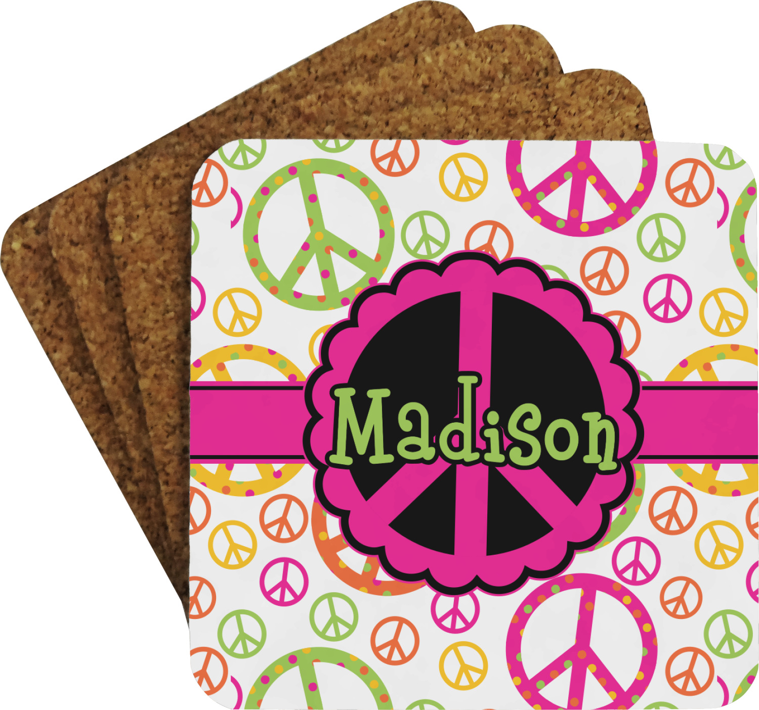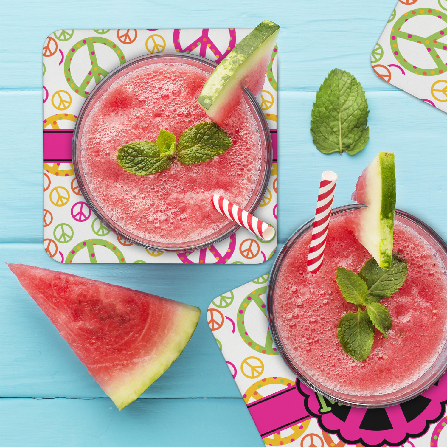 Your custom coasters have a smooth, laminated top and a cork bottom to prevent any unwanted slippage. We print your customized design atop this laminated surface, in bright and vibrant colors.