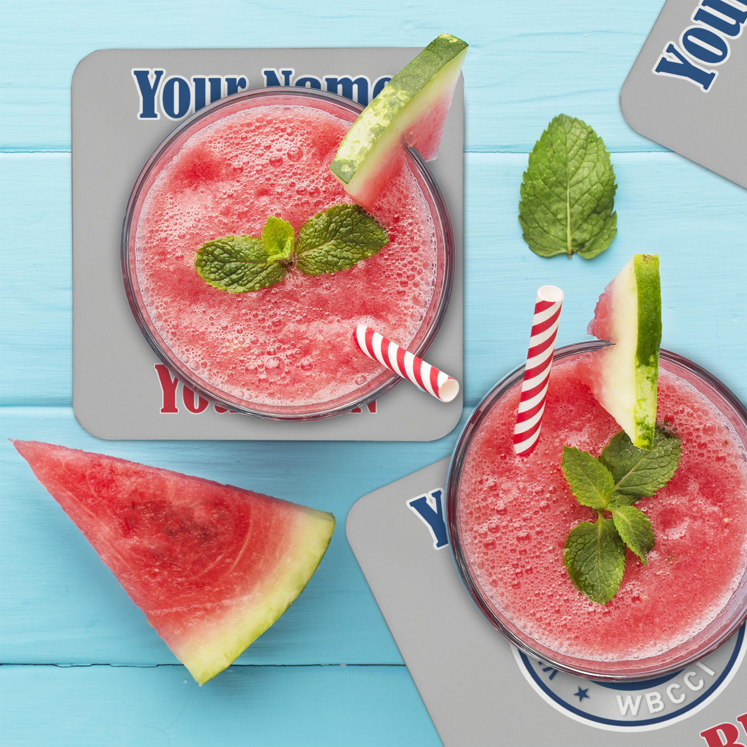 Your custom coasters have a smooth, laminated top and a cork bottom to prevent any unwanted slippage. We print your customized design atop this laminated surface, in bright and vibrant colors.