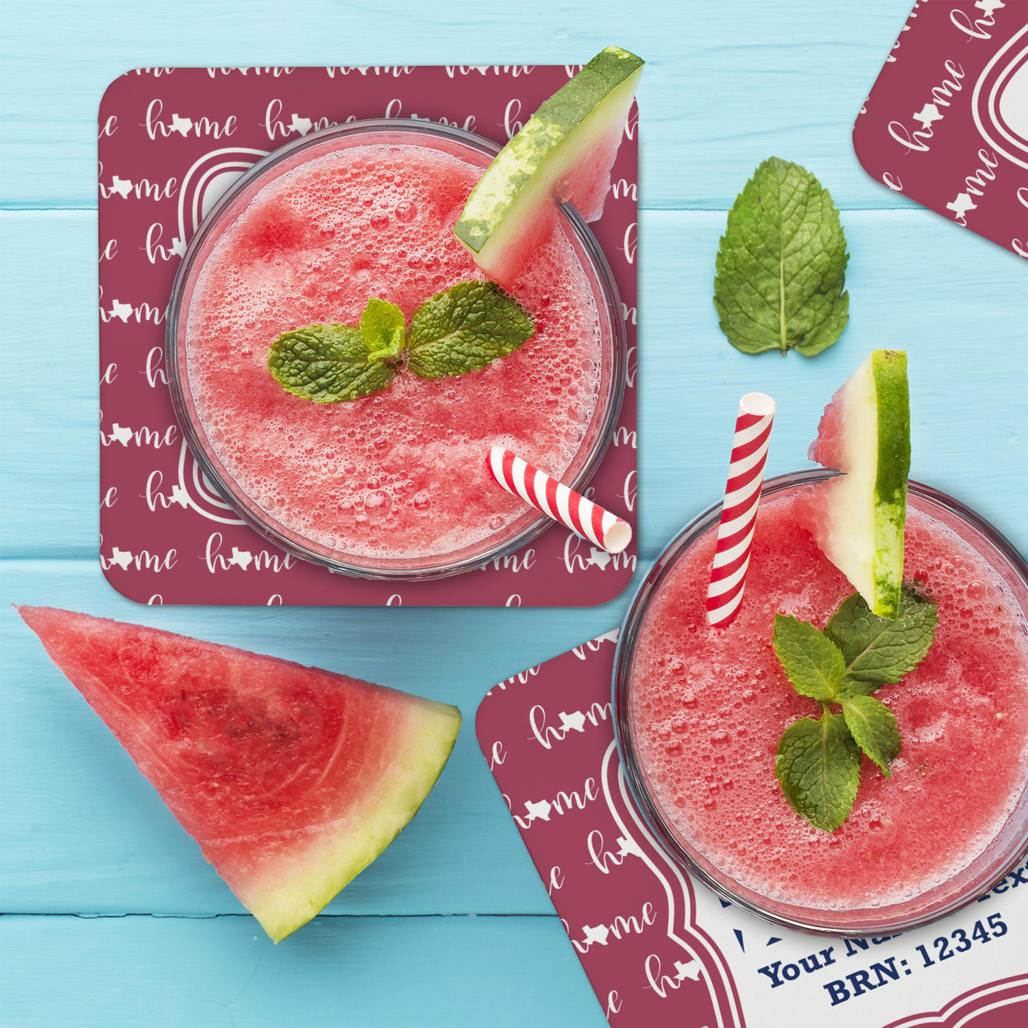 Your custom coasters have a smooth, laminated top and a cork bottom to prevent any unwanted slippage. We print your customized design atop this laminated surface, in bright and vibrant colors.