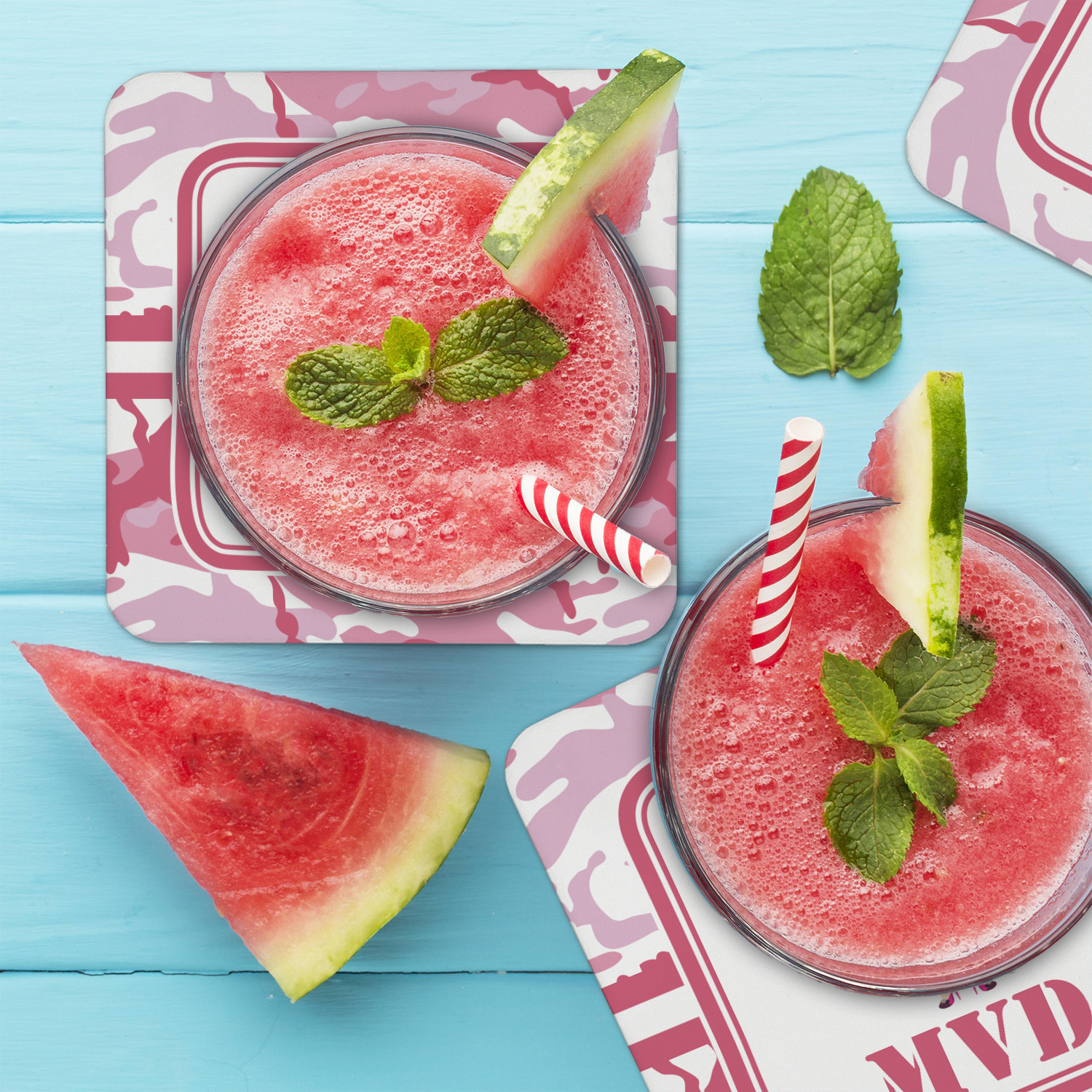 Your custom coasters have a smooth, laminated top and a cork bottom to prevent any unwanted slippage. We print your customized design atop this laminated surface, in bright and vibrant colors.