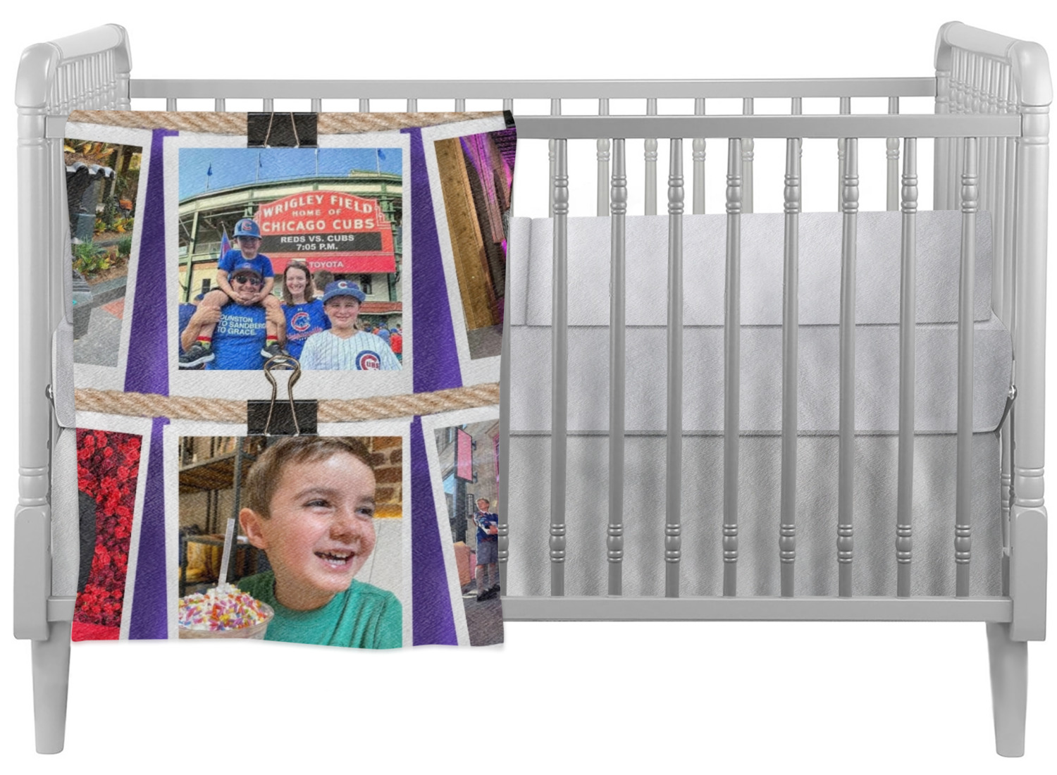 These crib comforters are printed, cut, and sewn by hand, right here in the USA. These blankets are made of two fabrics to provide two different, luxurious textures. The front is crafted from a plush, minky-like fabric, and displays your personalized design in bright colors. The back of these custom baby quilts are made of 320-count cotton sateen and can either be black or white in color, depending on your choice. Each comforter is stuffed with a down alternative to give your young one the maximum comfort while he or she sleeps. We also provide you with the option of customizing these baby quilts horizontally or vertically.