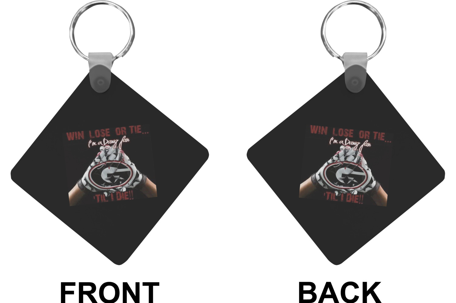 Our personalized keychains attach to the included metal, split key ring with a plastic, removable snap. Since a metal ring is included with your purchase, you have the liberty to keep your keys together on the ring, with or without your unique keychain. We offer this keychain in three different shapes: circle, heart, or diamond. We print your personalized design(s) on both sides of the key chain, and the surface has a glossy, reflective finish that only emphasizes your design. Each keychain is approximately 2.25 by 2.25 inches.