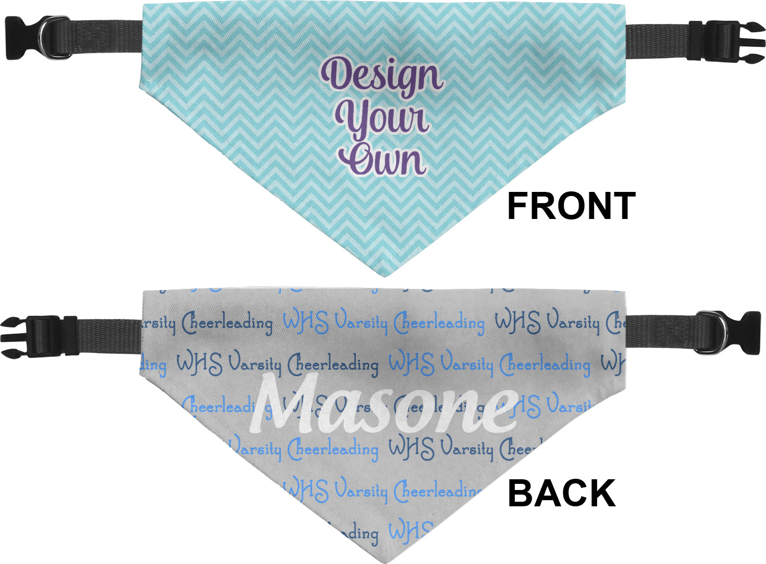 We print the front and back of these dog bandanas with your customized design. The bandana itself is made from a durable polyester, sewn together with a gap large enough to accommodate any collar. Regardless, the bandana includes a plain black, canvas collar with plastic snaps, that can easily be removed if desired. These dog bandana collars are available in four sizes: small, medium, large, and extra large. Please see our sizing chart for more information regarding the dimensions of each size.