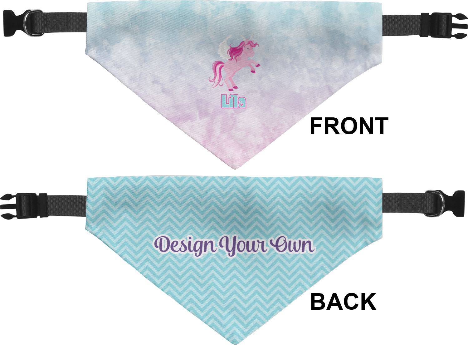 We print the front and back of these dog bandanas with your customized design. The bandana itself is made from a durable polyester, sewn together with a gap large enough to accommodate any collar. Regardless, the bandana includes a plain black, canvas collar with plastic snaps, that can easily be removed if desired. These dog bandana collars are available in four sizes: small, medium, large, and extra large. Please see our sizing chart for more information regarding the dimensions of each size.
