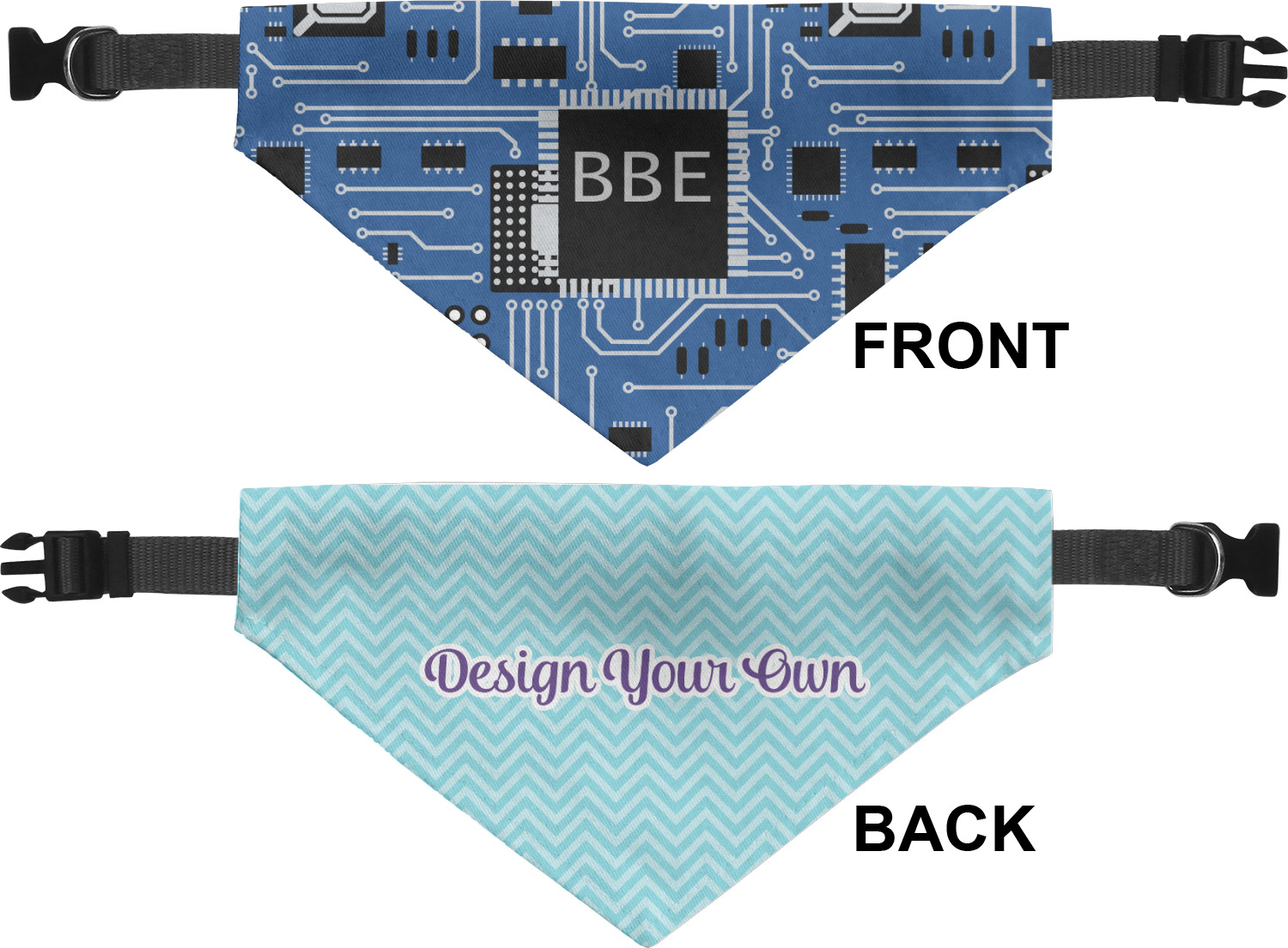 We print the front and back of these dog bandanas with your customized design. The bandana itself is made from a durable polyester, sewn together with a gap large enough to accommodate any collar. Regardless, the bandana includes a plain black, canvas collar with plastic snaps, that can easily be removed if desired. These dog bandana collars are available in four sizes: small, medium, large, and extra large. Please see our sizing chart for more information regarding the dimensions of each size.