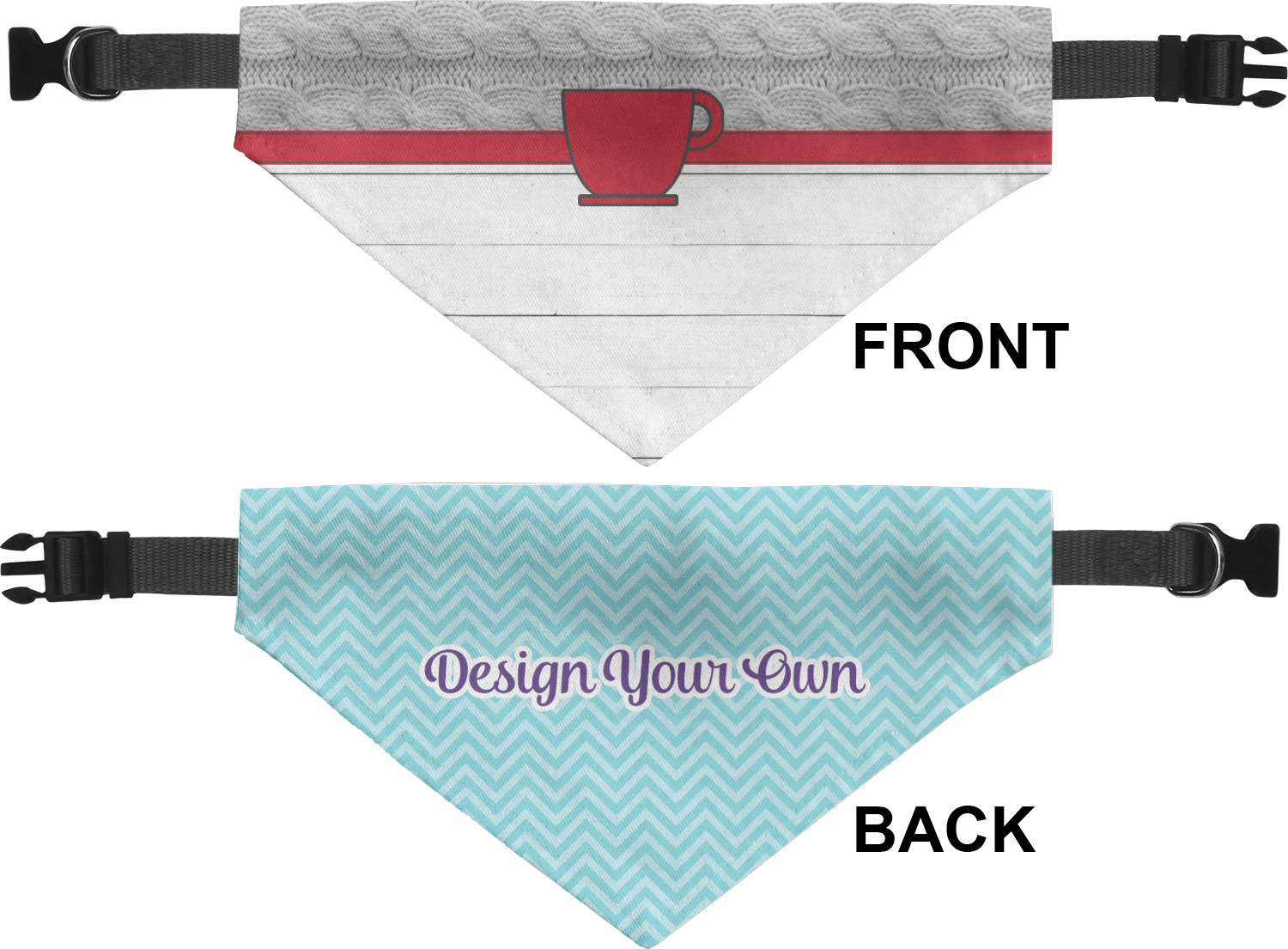 We print the front and back of these dog bandanas with your customized design. The bandana itself is made from a durable polyester, sewn together with a gap large enough to accommodate any collar. Regardless, the bandana includes a plain black, canvas collar with plastic snaps, that can easily be removed if desired. These dog bandana collars are available in four sizes: small, medium, large, and extra large. Please see our sizing chart for more information regarding the dimensions of each size.