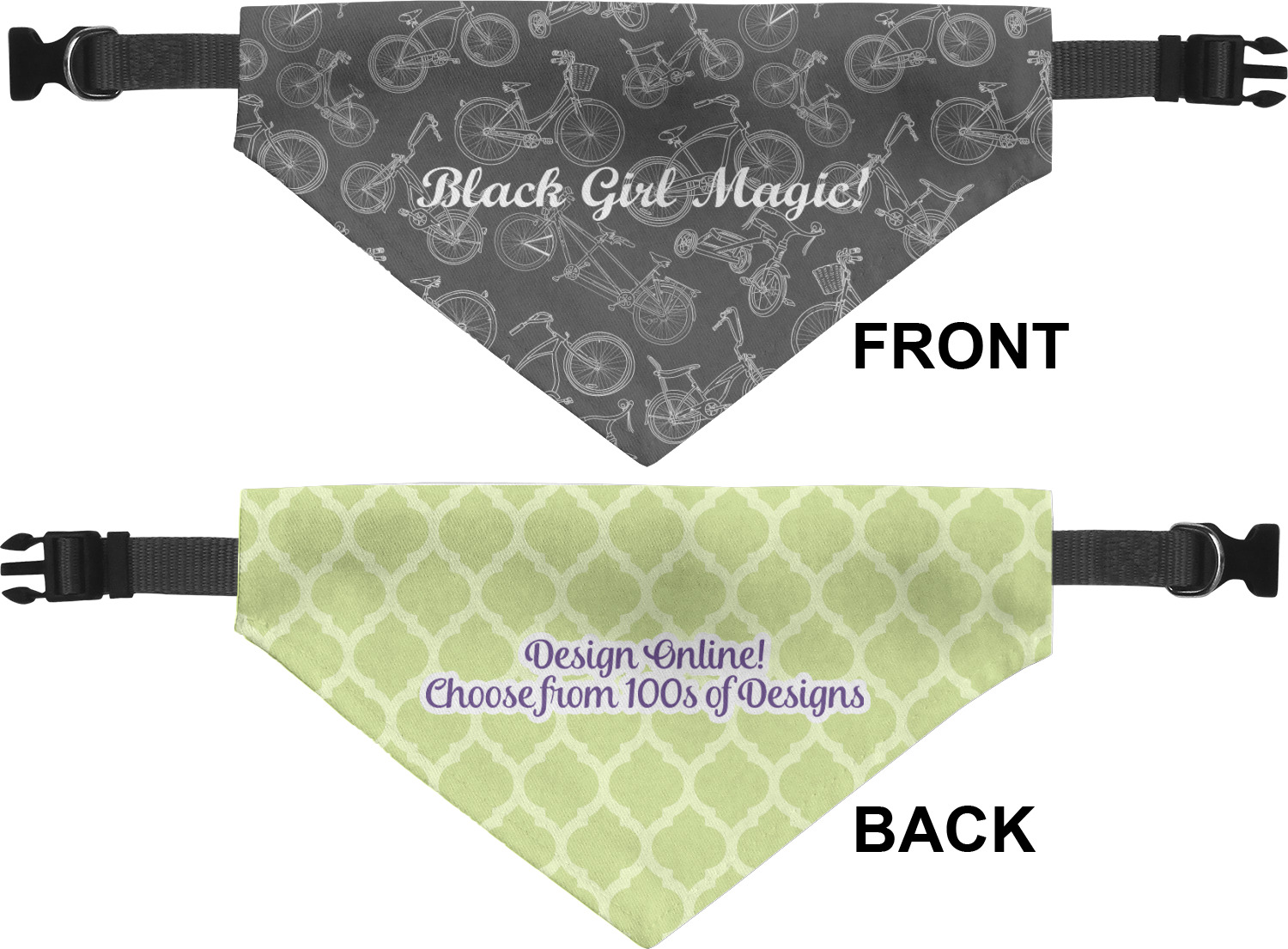 We print the front and back of these dog bandanas with your customized design. The bandana itself is made from a durable polyester, sewn together with a gap large enough to accommodate any collar. Regardless, the bandana includes a plain black, canvas collar with plastic snaps, that can easily be removed if desired. These dog bandana collars are available in four sizes: small, medium, large, and extra large. Please see our sizing chart for more information regarding the dimensions of each size.