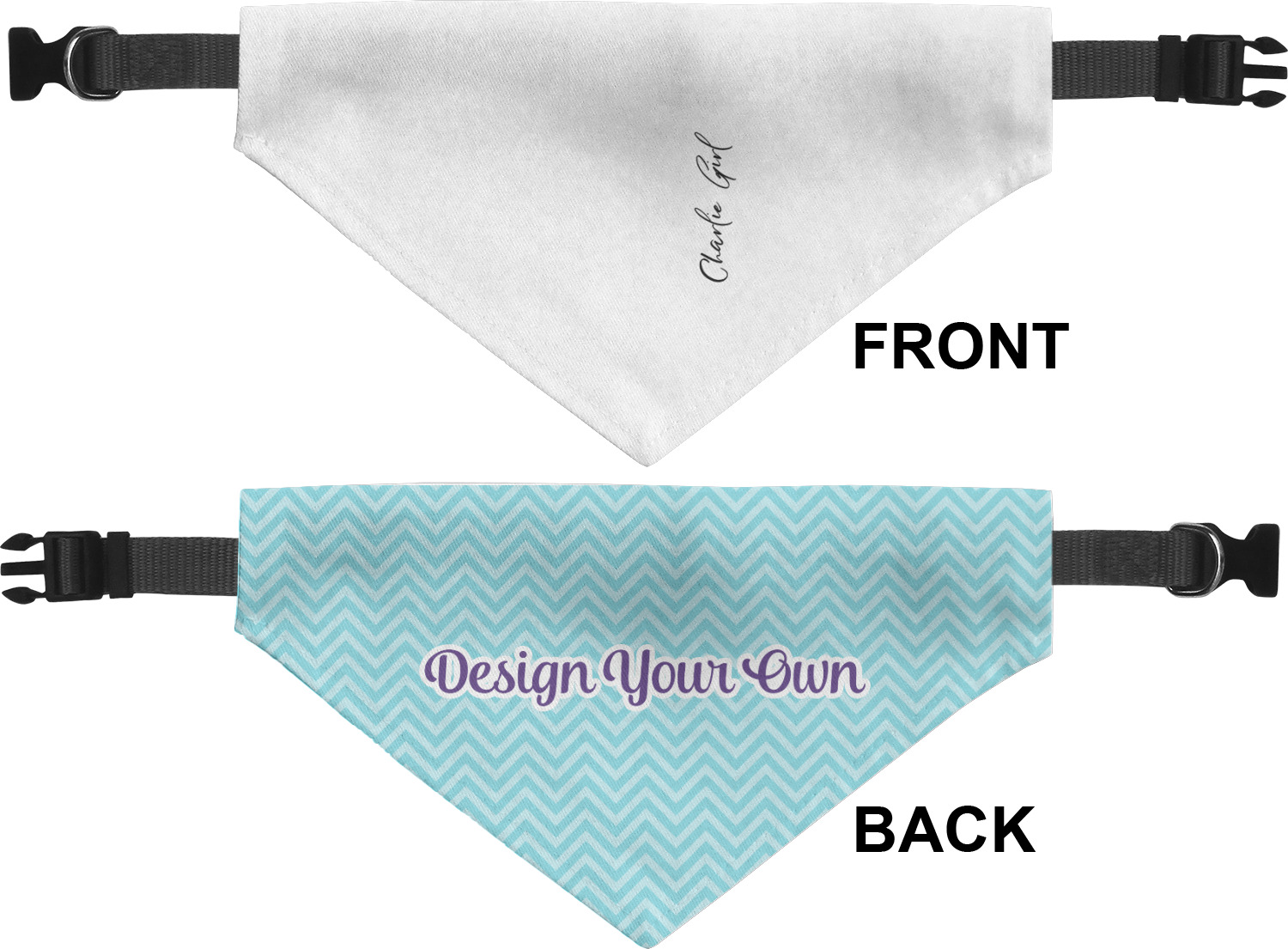 We print the front and back of these dog bandanas with your customized design. The bandana itself is made from a durable polyester, sewn together with a gap large enough to accommodate any collar. Regardless, the bandana includes a plain black, canvas collar with plastic snaps, that can easily be removed if desired. These dog bandana collars are available in four sizes: small, medium, large, and extra large. Please see our sizing chart for more information regarding the dimensions of each size.