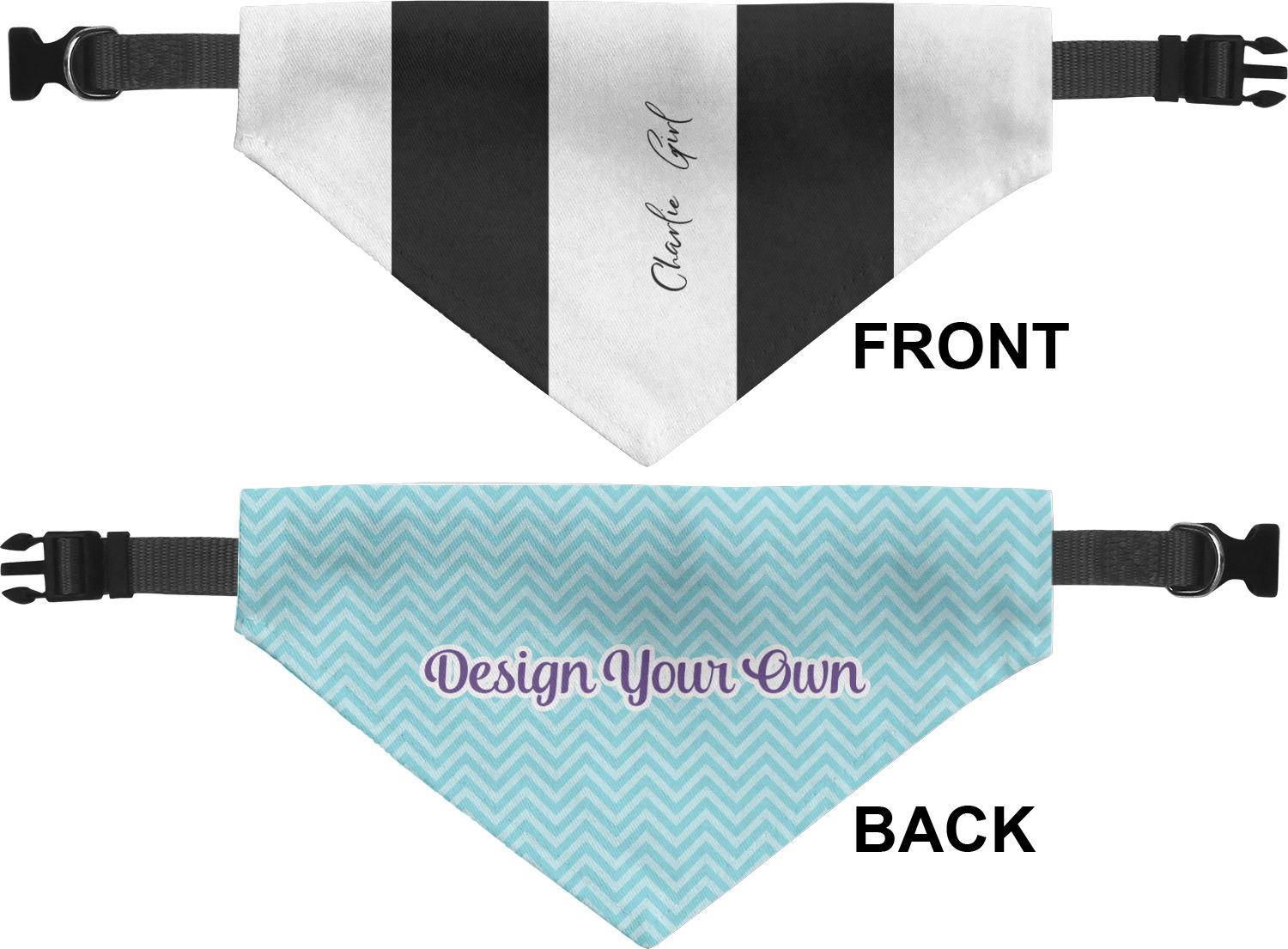 We print the front and back of these dog bandanas with your customized design. The bandana itself is made from a durable polyester, sewn together with a gap large enough to accommodate any collar. Regardless, the bandana includes a plain black, canvas collar with plastic snaps, that can easily be removed if desired. These dog bandana collars are available in four sizes: small, medium, large, and extra large. Please see our sizing chart for more information regarding the dimensions of each size.