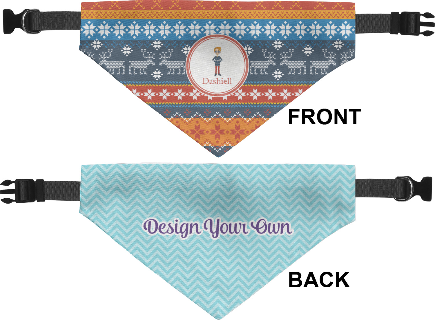 We print the front and back of these dog bandanas with your customized design. The bandana itself is made from a durable polyester, sewn together with a gap large enough to accommodate any collar. Regardless, the bandana includes a plain black, canvas collar with plastic snaps, that can easily be removed if desired. These dog bandana collars are available in four sizes: small, medium, large, and extra large. Please see our sizing chart for more information regarding the dimensions of each size.