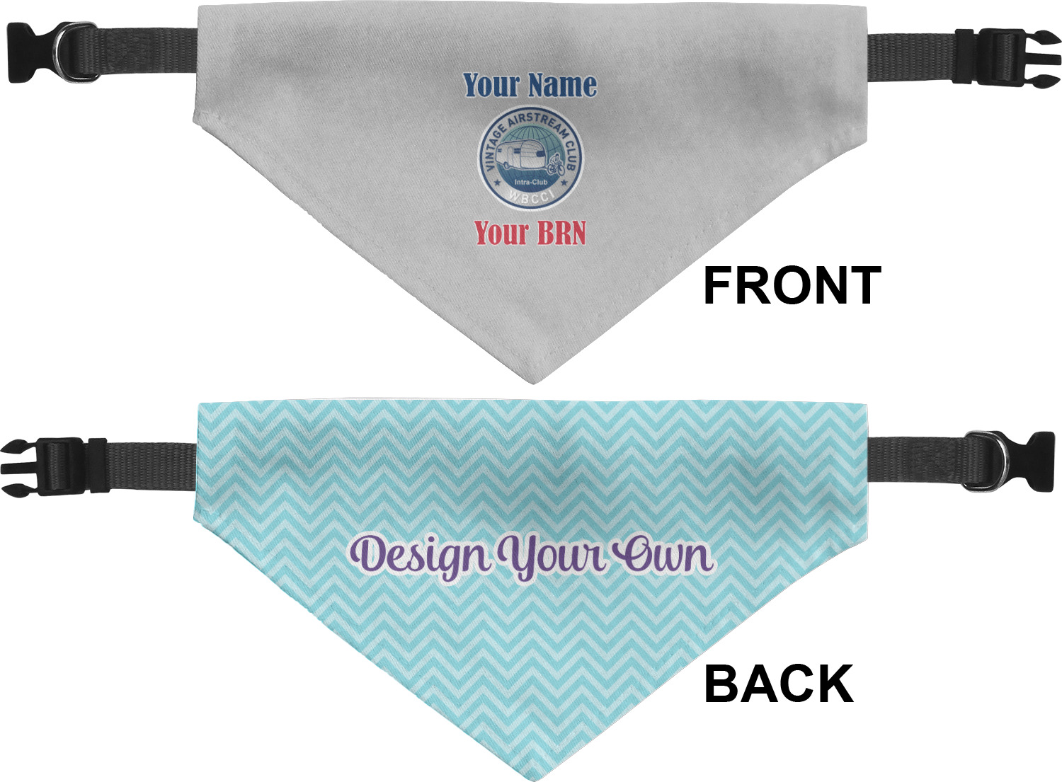 We print the front and back of these dog bandanas with your customized design. The bandana itself is made from a durable polyester, sewn together with a gap large enough to accommodate any collar. Regardless, the bandana includes a plain black, canvas collar with plastic snaps, that can easily be removed if desired. These dog bandana collars are available in four sizes: small, medium, large, and extra large. Please see our sizing chart for more information regarding the dimensions of each size.