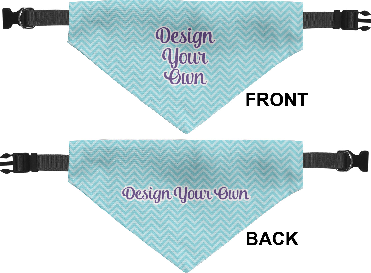 We print the front and back of these dog bandanas with your customized design. The bandana itself is made from a durable polyester, sewn together with a gap large enough to accommodate any collar. Regardless, the bandana includes a plain black, canvas collar with plastic snaps, that can easily be removed if desired. These dog bandana collars are available in four sizes: small, medium, large, and extra large. Please see our sizing chart for more information regarding the dimensions of each size.
