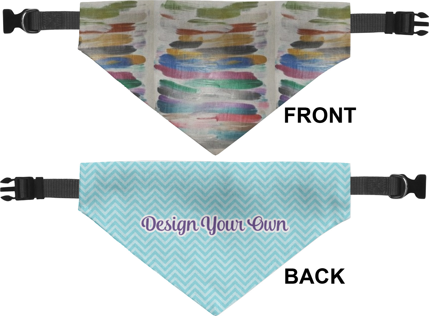 We print the front and back of these dog bandanas with your customized design. The bandana itself is made from a durable polyester, sewn together with a gap large enough to accommodate any collar. Regardless, the bandana includes a plain black, canvas collar with plastic snaps, that can easily be removed if desired. These dog bandana collars are available in four sizes: small, medium, large, and extra large. Please see our sizing chart for more information regarding the dimensions of each size.