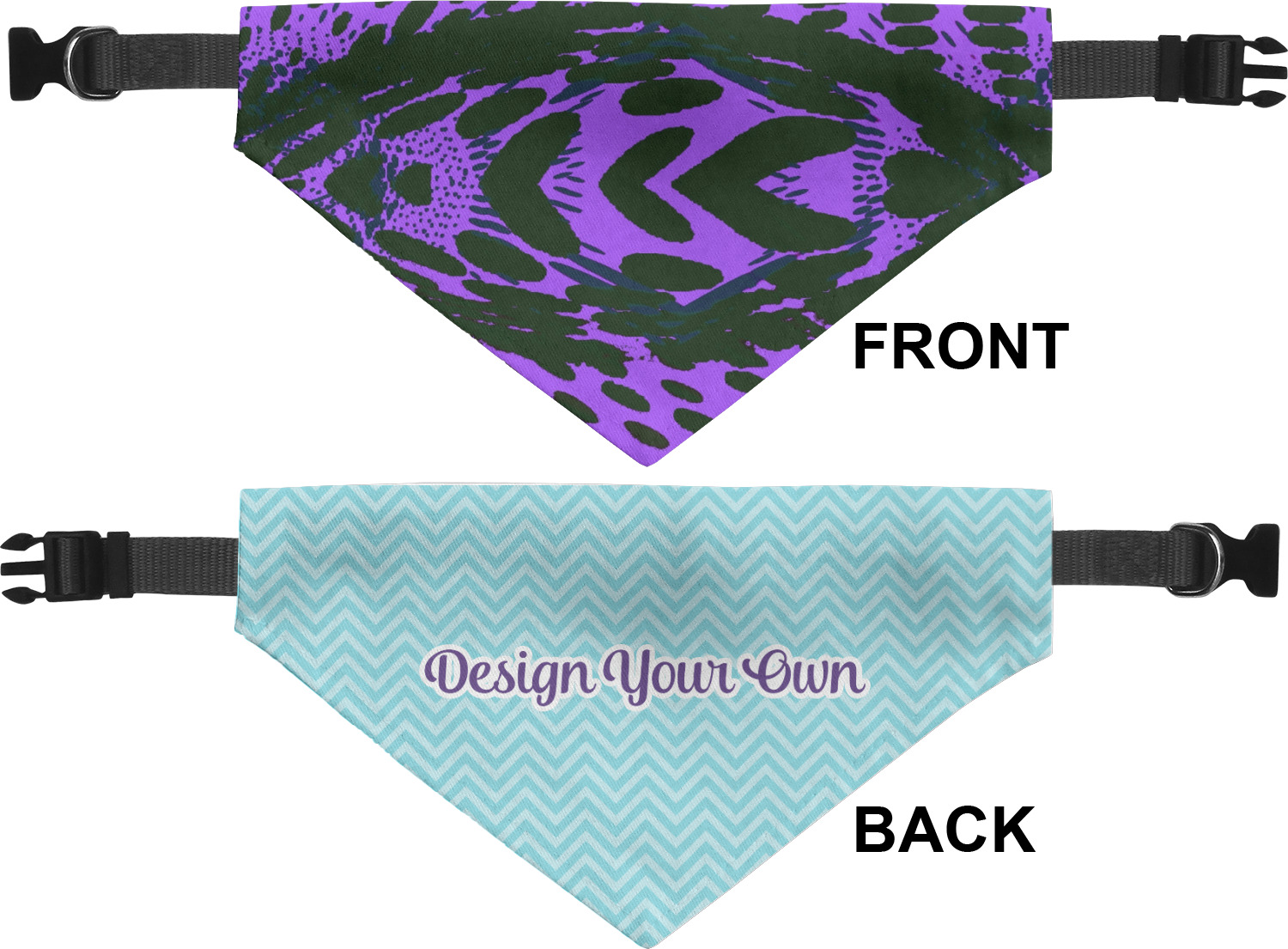 We print the front and back of these dog bandanas with your customized design. The bandana itself is made from a durable polyester, sewn together with a gap large enough to accommodate any collar. Regardless, the bandana includes a plain black, canvas collar with plastic snaps, that can easily be removed if desired. These dog bandana collars are available in four sizes: small, medium, large, and extra large. Please see our sizing chart for more information regarding the dimensions of each size.