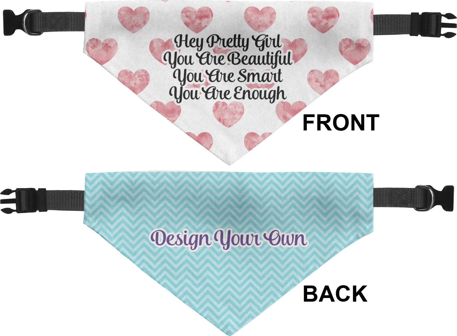 We print the front and back of these dog bandanas with your customized design. The bandana itself is made from a durable polyester, sewn together with a gap large enough to accommodate any collar. Regardless, the bandana includes a plain black, canvas collar with plastic snaps, that can easily be removed if desired. These dog bandana collars are available in four sizes: small, medium, large, and extra large. Please see our sizing chart for more information regarding the dimensions of each size.