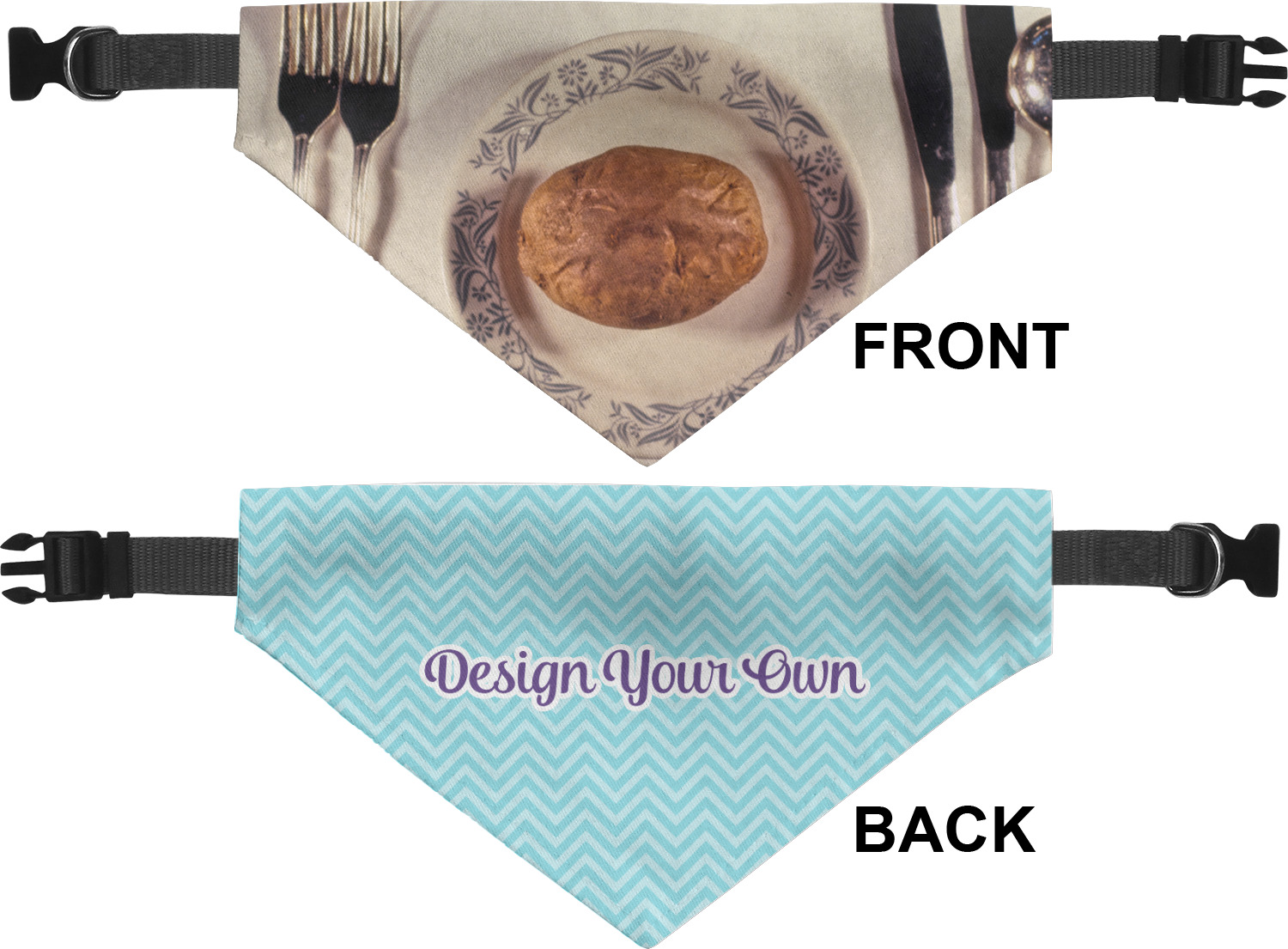 We print the front and back of these dog bandanas with your customized design. The bandana itself is made from a durable polyester, sewn together with a gap large enough to accommodate any collar. Regardless, the bandana includes a plain black, canvas collar with plastic snaps, that can easily be removed if desired. These dog bandana collars are available in four sizes: small, medium, large, and extra large. Please see our sizing chart for more information regarding the dimensions of each size.