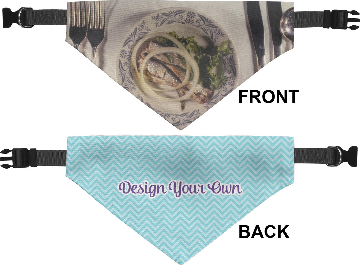We print the front and back of these dog bandanas with your customized design. The bandana itself is made from a durable polyester, sewn together with a gap large enough to accommodate any collar. Regardless, the bandana includes a plain black, canvas collar with plastic snaps, that can easily be removed if desired. These dog bandana collars are available in four sizes: small, medium, large, and extra large. Please see our sizing chart for more information regarding the dimensions of each size.