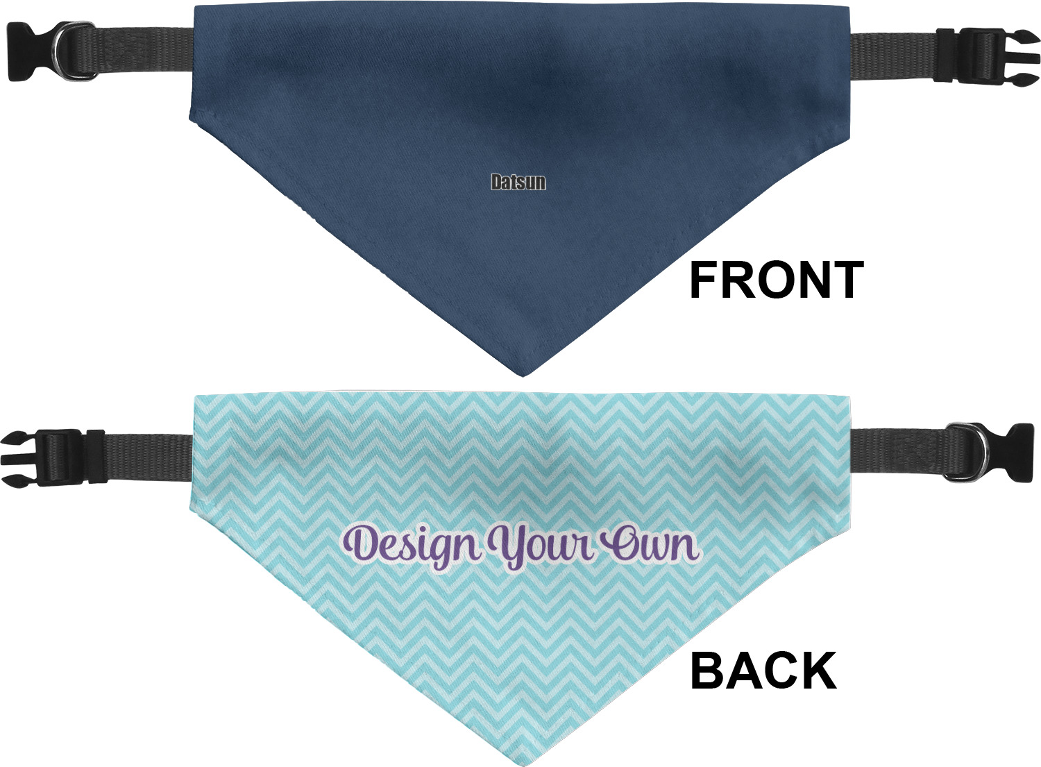 We print the front and back of these dog bandanas with your customized design. The bandana itself is made from a durable polyester, sewn together with a gap large enough to accommodate any collar. Regardless, the bandana includes a plain black, canvas collar with plastic snaps, that can easily be removed if desired. These dog bandana collars are available in four sizes: small, medium, large, and extra large. Please see our sizing chart for more information regarding the dimensions of each size.