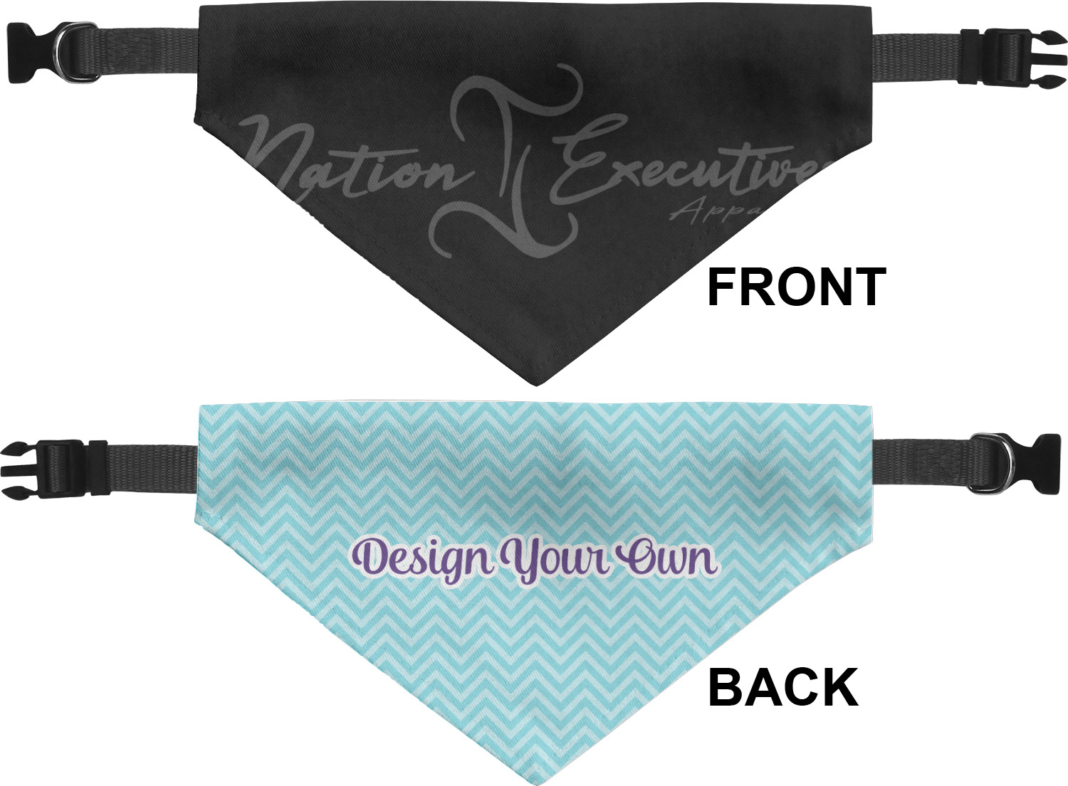 We print the front and back of these dog bandanas with your customized design. The bandana itself is made from a durable polyester, sewn together with a gap large enough to accommodate any collar. Regardless, the bandana includes a plain black, canvas collar with plastic snaps, that can easily be removed if desired. These dog bandana collars are available in four sizes: small, medium, large, and extra large. Please see our sizing chart for more information regarding the dimensions of each size.