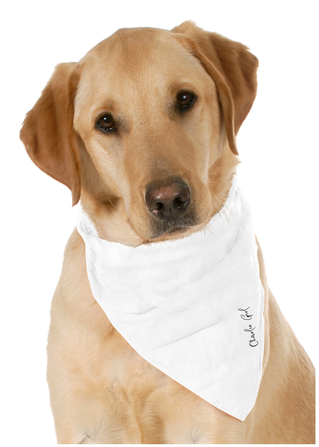 This beautiful pet bandana really is the perfect accessory. It is made from a silky feeling polyester and measures at approximately 23" x 23". Your personalization will be printed on a diagonal, so that you are able to read the personalization when folded into a triangle. This bandana fits best on large dogs, but can be folded smaller if there is no personalized text to fit smaller pets.