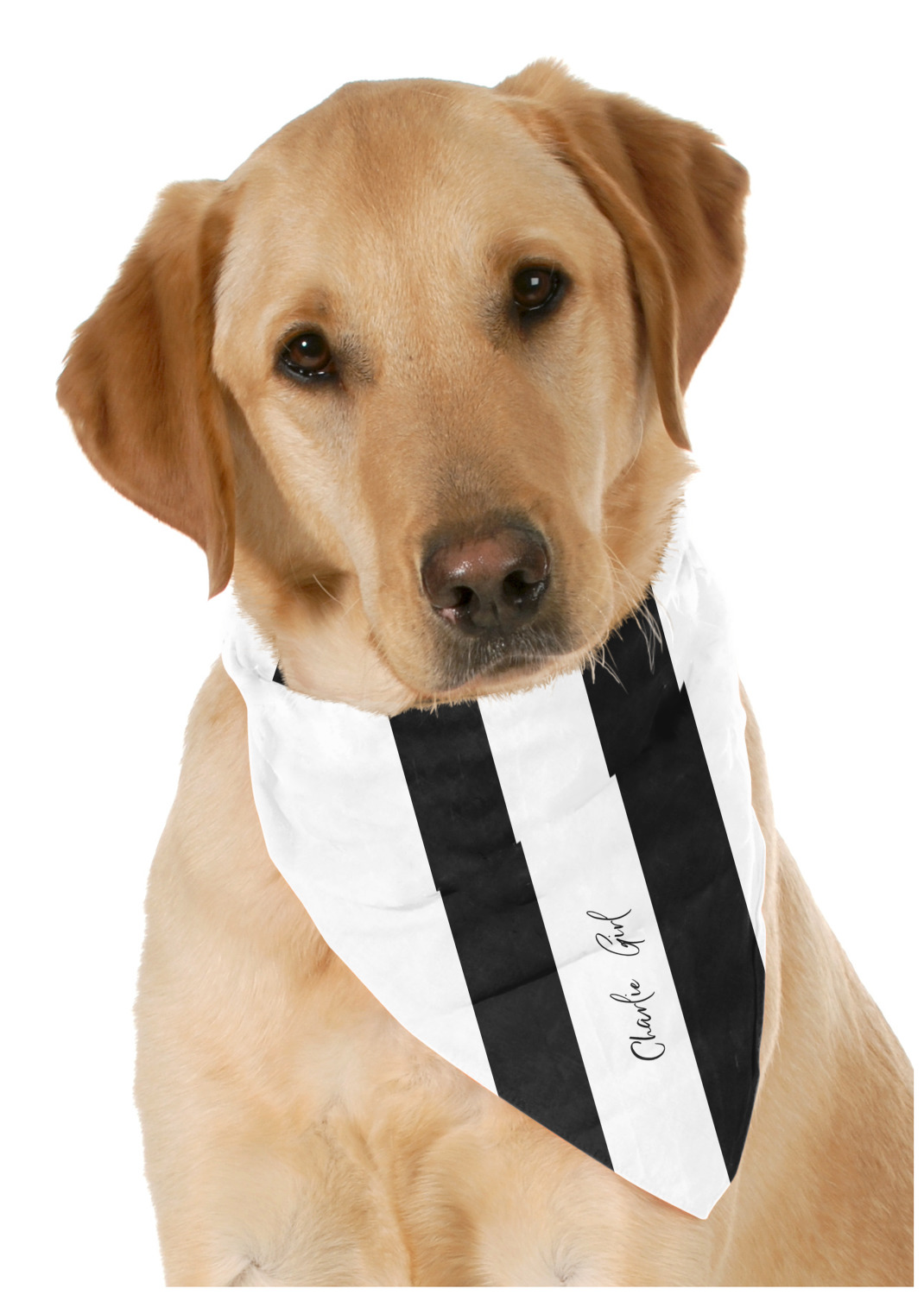 This beautiful pet bandana really is the perfect accessory. It is made from a silky feeling polyester and measures at approximately 23" x 23". Your personalization will be printed on a diagonal, so that you are able to read the personalization when folded into a triangle. This bandana fits best on large dogs, but can be folded smaller if there is no personalized text to fit smaller pets.