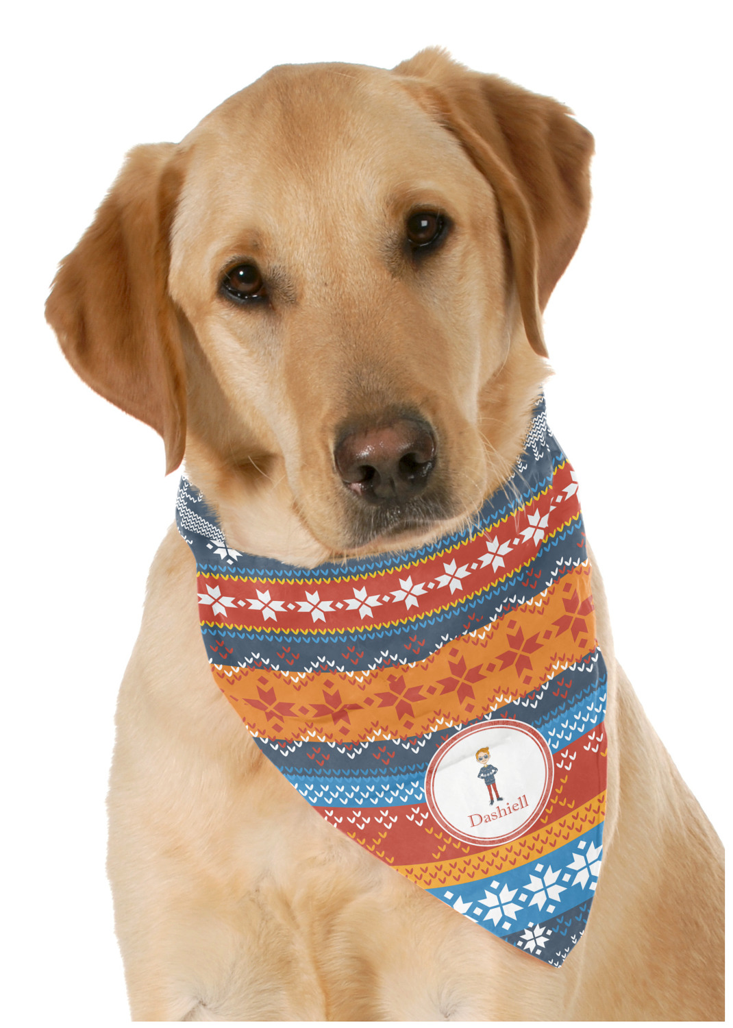 This beautiful pet bandana really is the perfect accessory. It is made from a silky feeling polyester and measures at approximately 23" x 23". Your personalization will be printed on a diagonal, so that you are able to read the personalization when folded into a triangle. This bandana fits best on large dogs, but can be folded smaller if there is no personalized text to fit smaller pets.